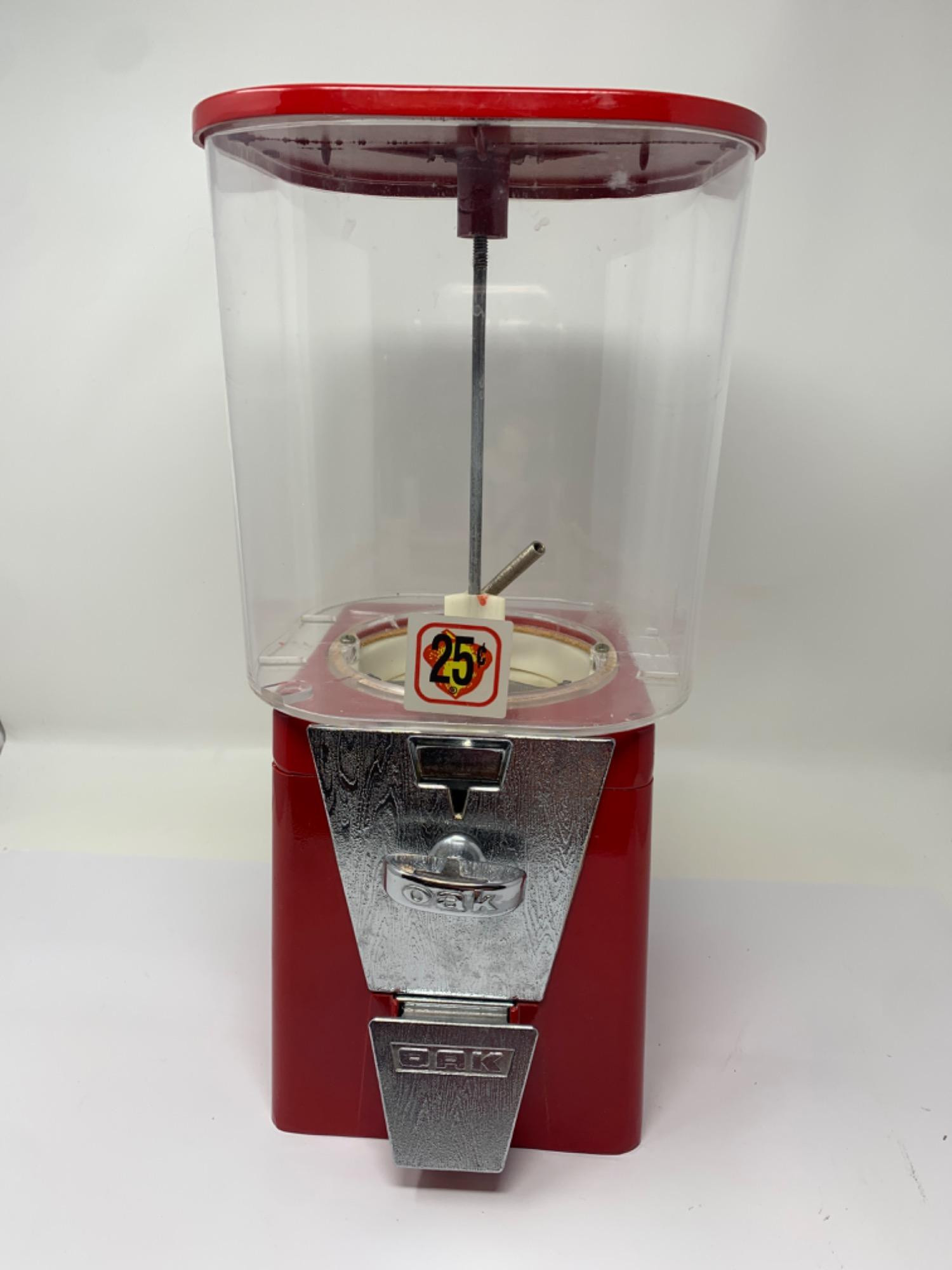 Reproduction Oak Gumball machine. Jar is plastic and other components are metal. Key misplaced at the moment. Looks new