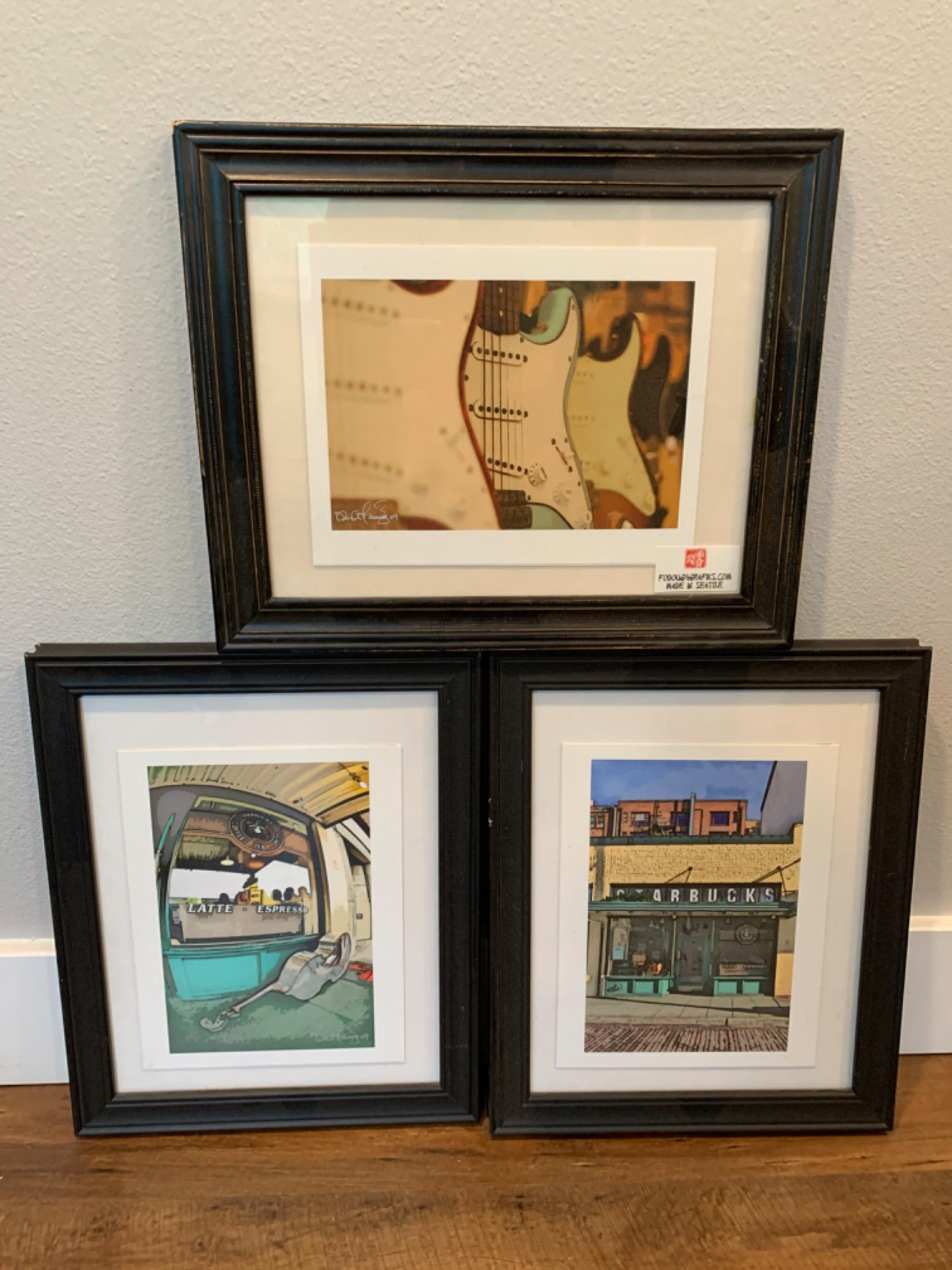 Lot # 86 - Seattle Artist Daniel Flemming - Framed Art Trio-Starbucks, Instrument