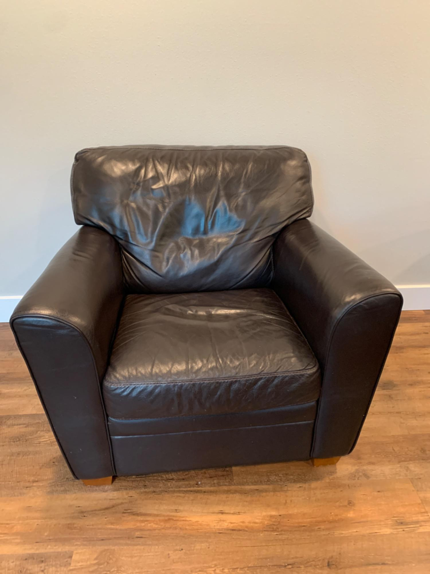 Cozy black leather styled side chair. In great condition with no obvious damage or wear. Cushions attached. Still holding shape and firmness Bulky, bring help to load. Bring tools to remove feet for easier access through door.