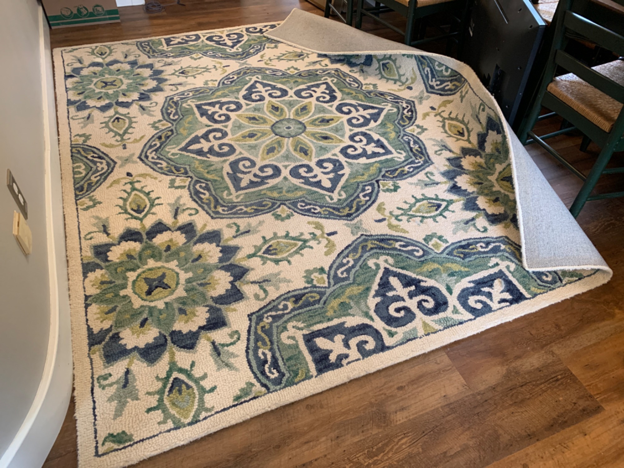 100% Virgin wool rug Hand hooked and quality construction. Normal wear and light cleaning would refresh. No obvious stains or damage found cream, green, blue, yellow colors