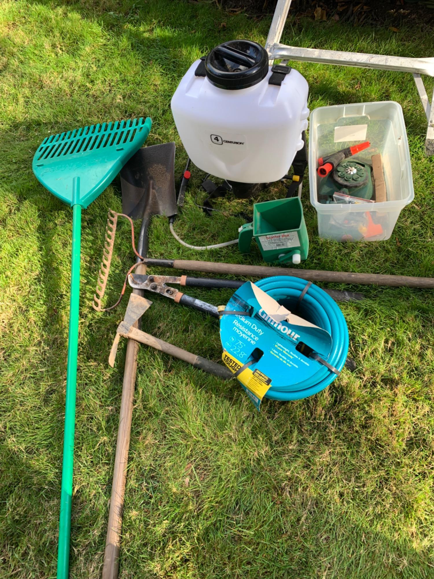 Centurian 4-gallon backpack sprayer. Brand new 75ft garden hose. Assorted hand tools and sprinkler tools. See pics for details.