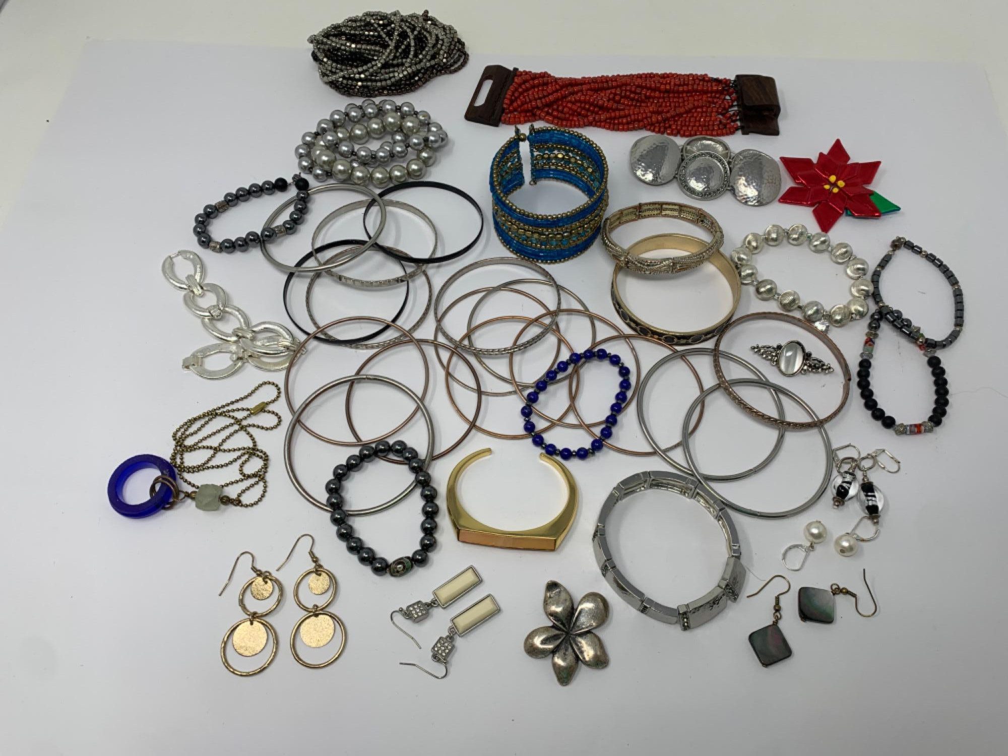 Mix of bracelets and earrings. Mostly metal bands with some beaded cuffs and singles. Assorted earrings and pins.