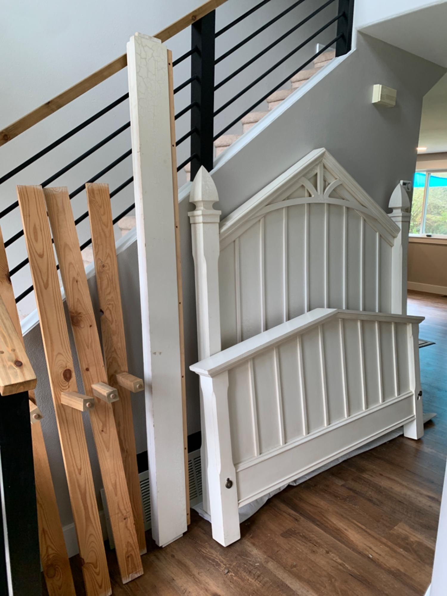 Large, whitewashed wood frame. Queen bed size VERY Heavy and solid. Will require help to load. Aged paint style look. 4 support rails with feet. Side rails Easy load location.