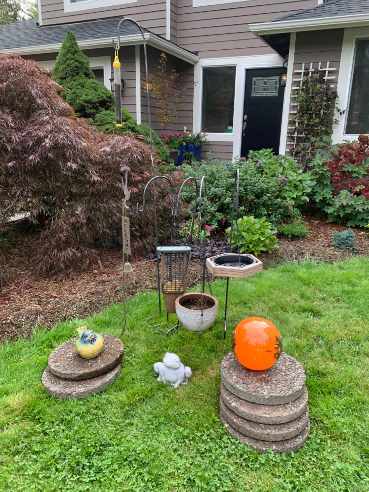 Assorted yard art and round stone pavers with aggregate surface. Solar globe, resin frog, clay bird. Bird feeders, plant pot and shepherd hooks.