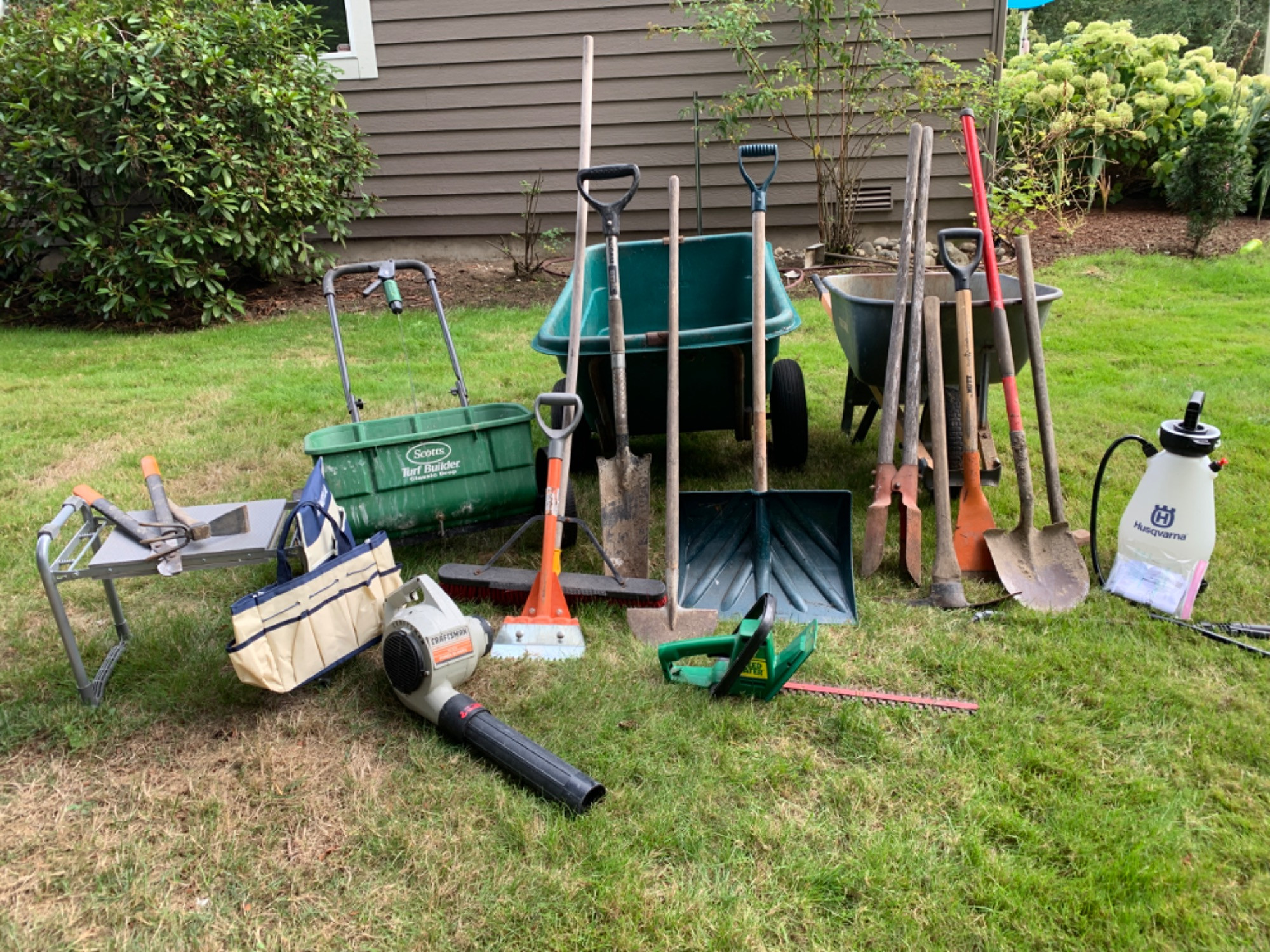 See pics for details. Husqvarna sprayer. Large haul bucket, wheelbarrow, spreader. Framed seat/knee pad Electric hedge trimmer and blower powered up Assorted hand tools