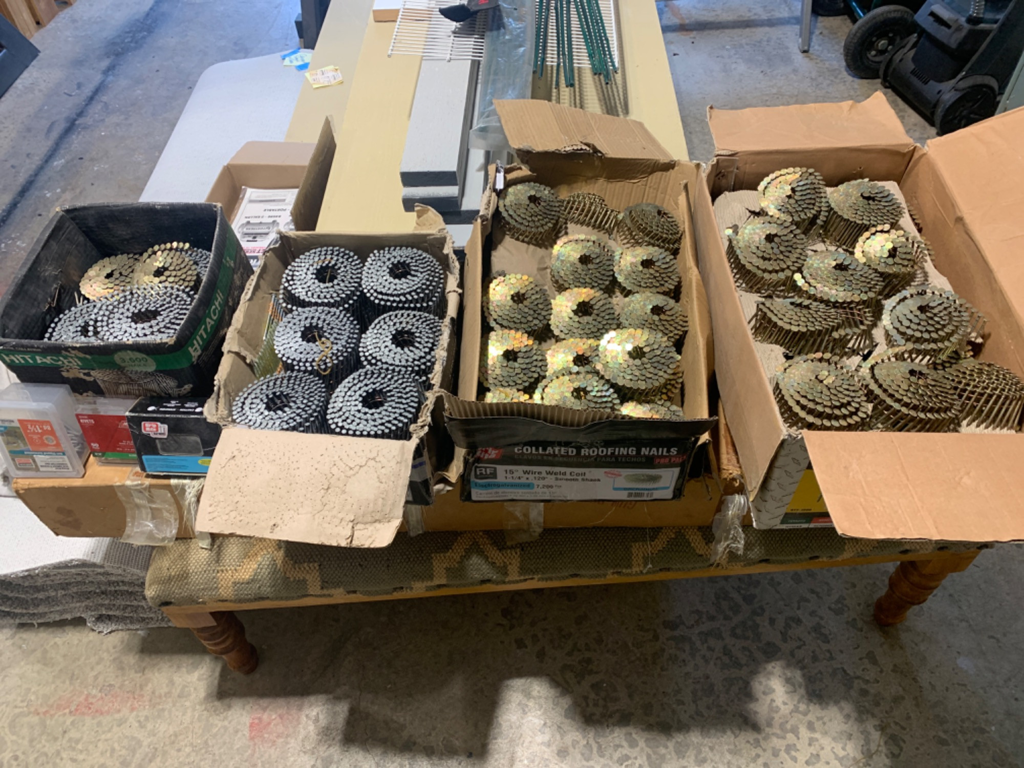 Four cases of nail fasteners in coil rings. See pics for details. Hitachi, Steelhead and Fanaco brands. A few small boxes of screws and nails.