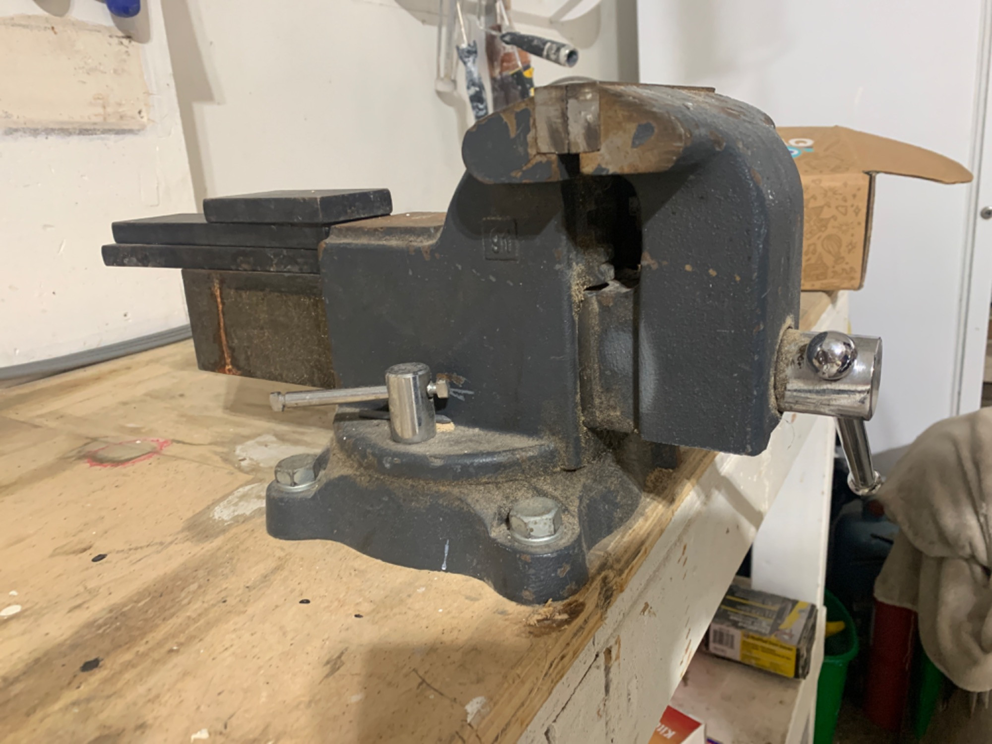 Wilton Bent vice. Includes three lead bars for weight. Bolted to workbench. Bring tools to dismount. Some rust, very solid.
