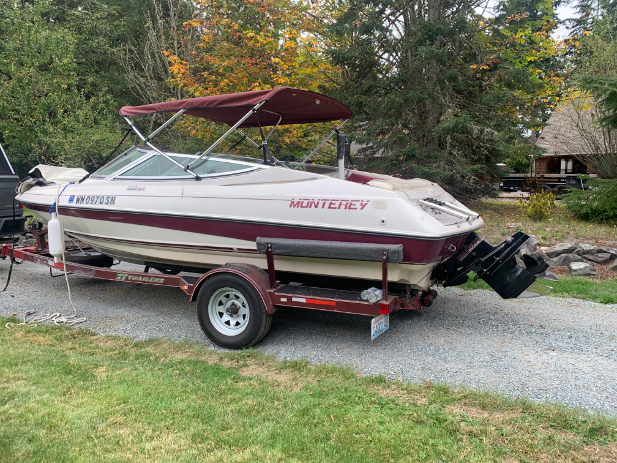 Monterey 189SCR power boat, 18.5feet long. Single motor. 4.6Liter V6 Merc cruiser Hours are 1024. Still operational. Hummingbird duck finder GPS. Bluetooth AM/FM stereo. Ropes, bumpers, telescoping ladder. Bimini top and cover. Boat tags are current through OCT 2024. Trailer tags good until 2025. Item is not taxed when sold. Department of Licensing collects tax upon transfer of title
