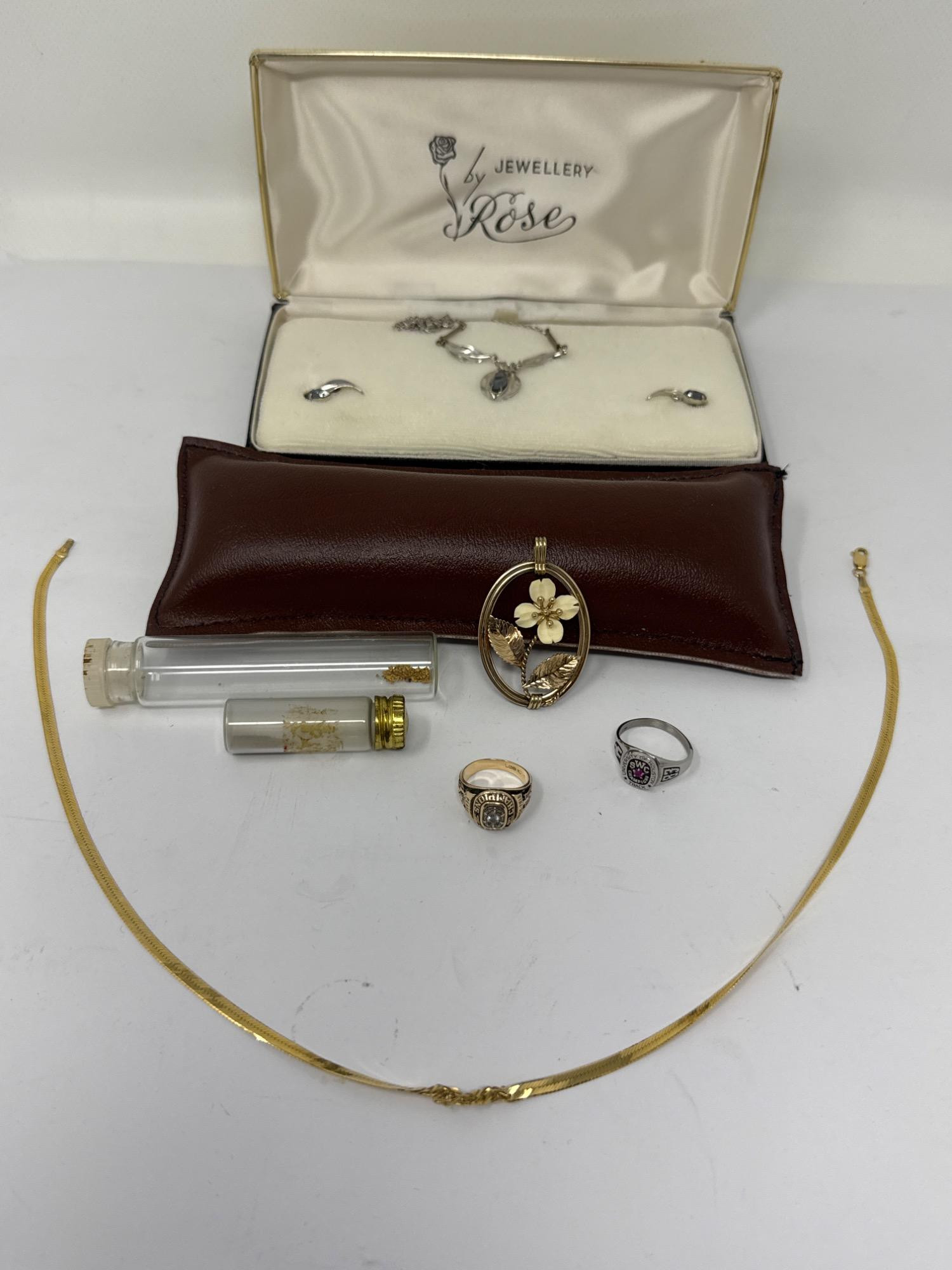 14 karat gold necklace. Made in Italy. Chain has some damage. Two class rings. Ladies. One is 10 carat. Two tubes of gold flakes. Silver and gemstone set. Vintage flower pendant. Rings are size 6. Weight is 12 g.