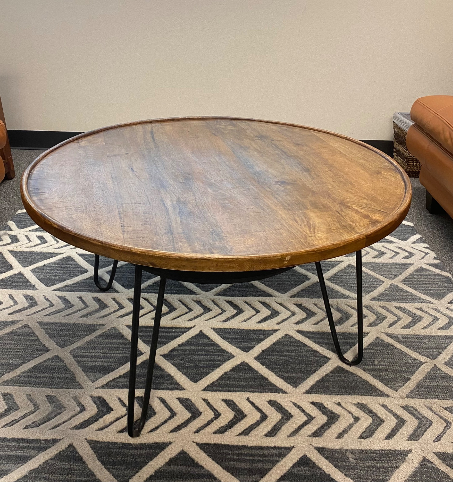 Wood and metal coffee table. Smaller side table in exotic wood. Both are light natural color. Small table dimensions 16.5in diameter, 18in tall.