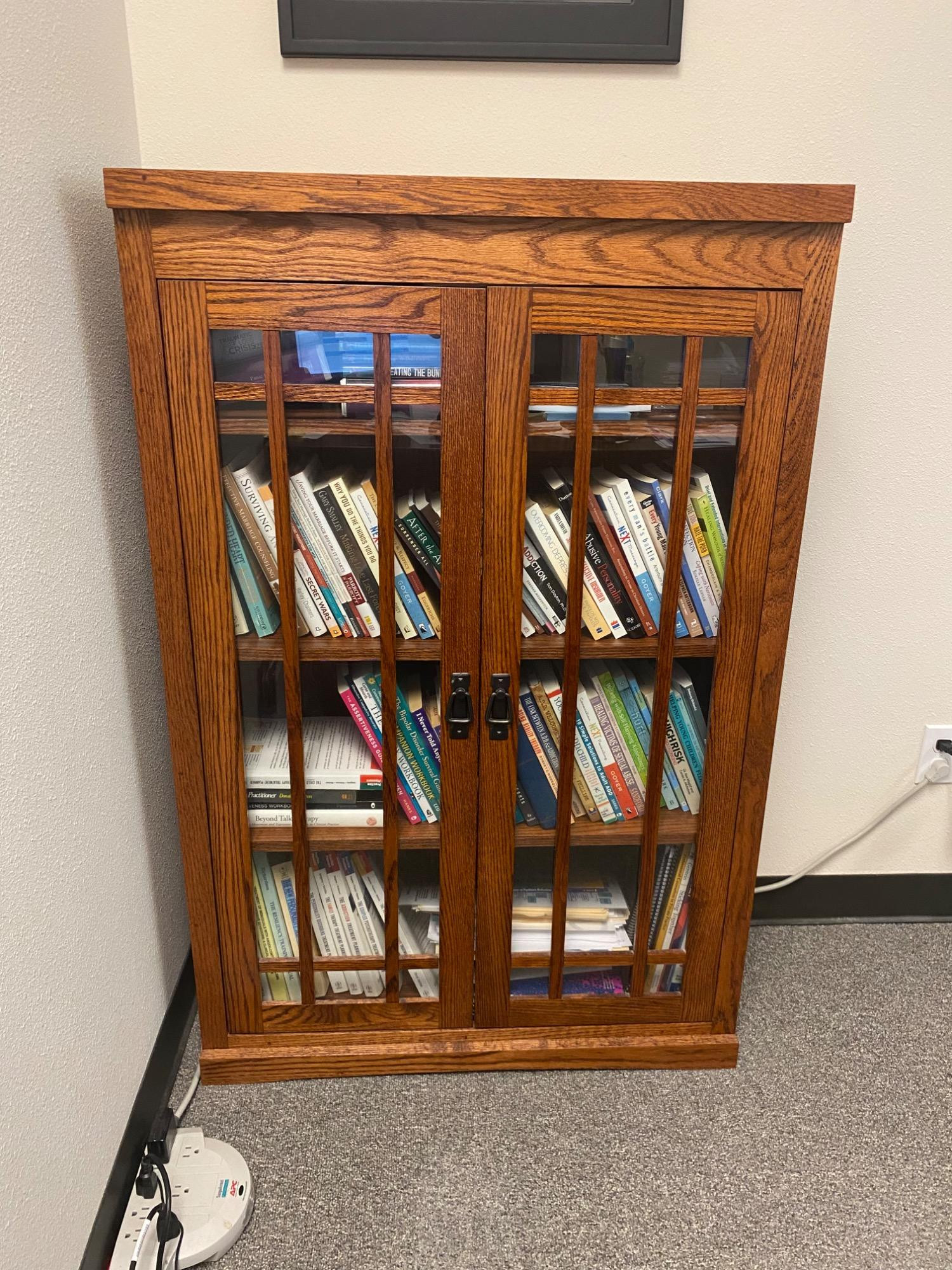 Mission style wood bookcase with glass doors. Adjustable shelves. Contents not included