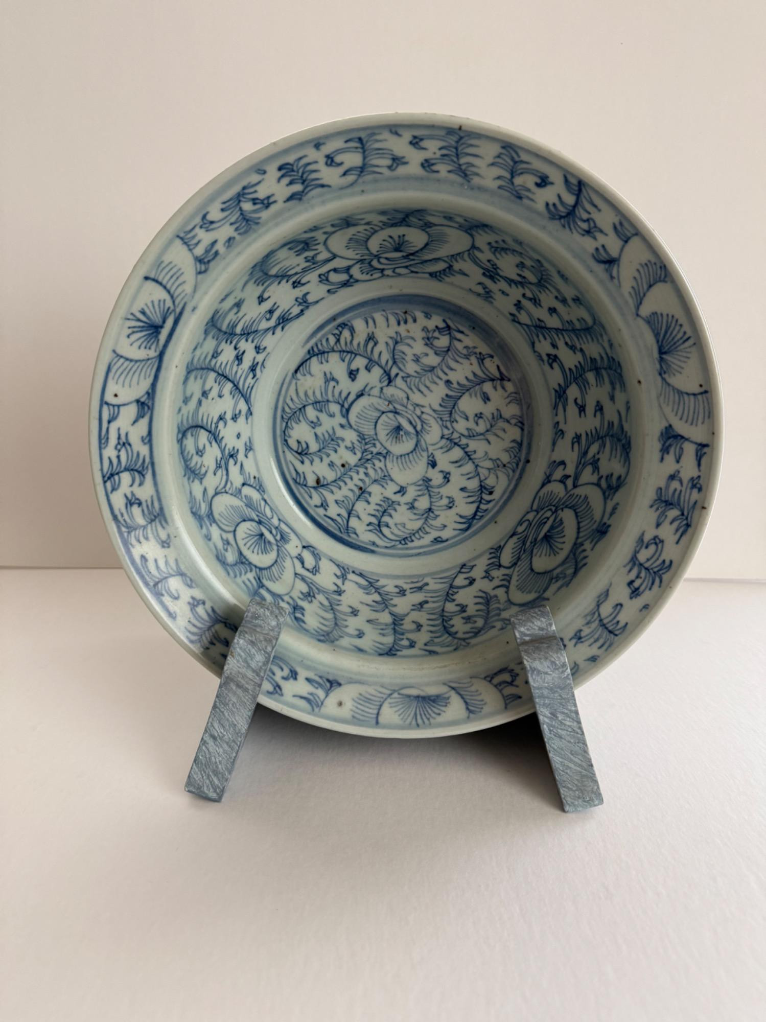 Basin, deep form with narrow rim, stylized blue and white floral design, Asian origin, probably Chinese, Qing Dynasty style, camellia or lotus pattern, orange peel surface. Probably ca. mid-19th-early 20th c. 11 1/4" dia. X 4" d.