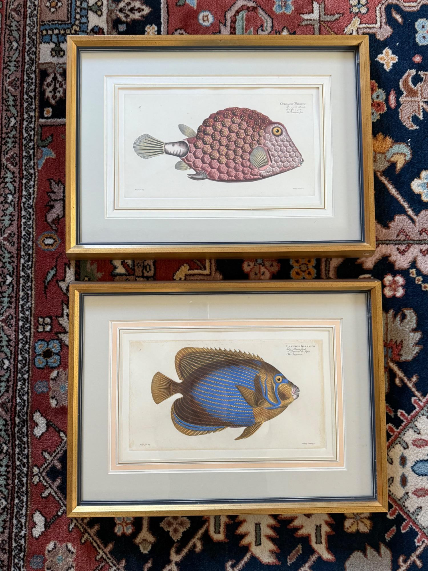 Prints, copper engravings, exotic fish, scientific studies, impressions by Lud- wig Schmidt after the original drawings by Kruger. These images ca. 1800/ early 19th century. Appear to be hand colored. In squared box frames with gilded finish and dark liner, matted. 15 1/2" h. x 21 1/2" w. 2 pcs.