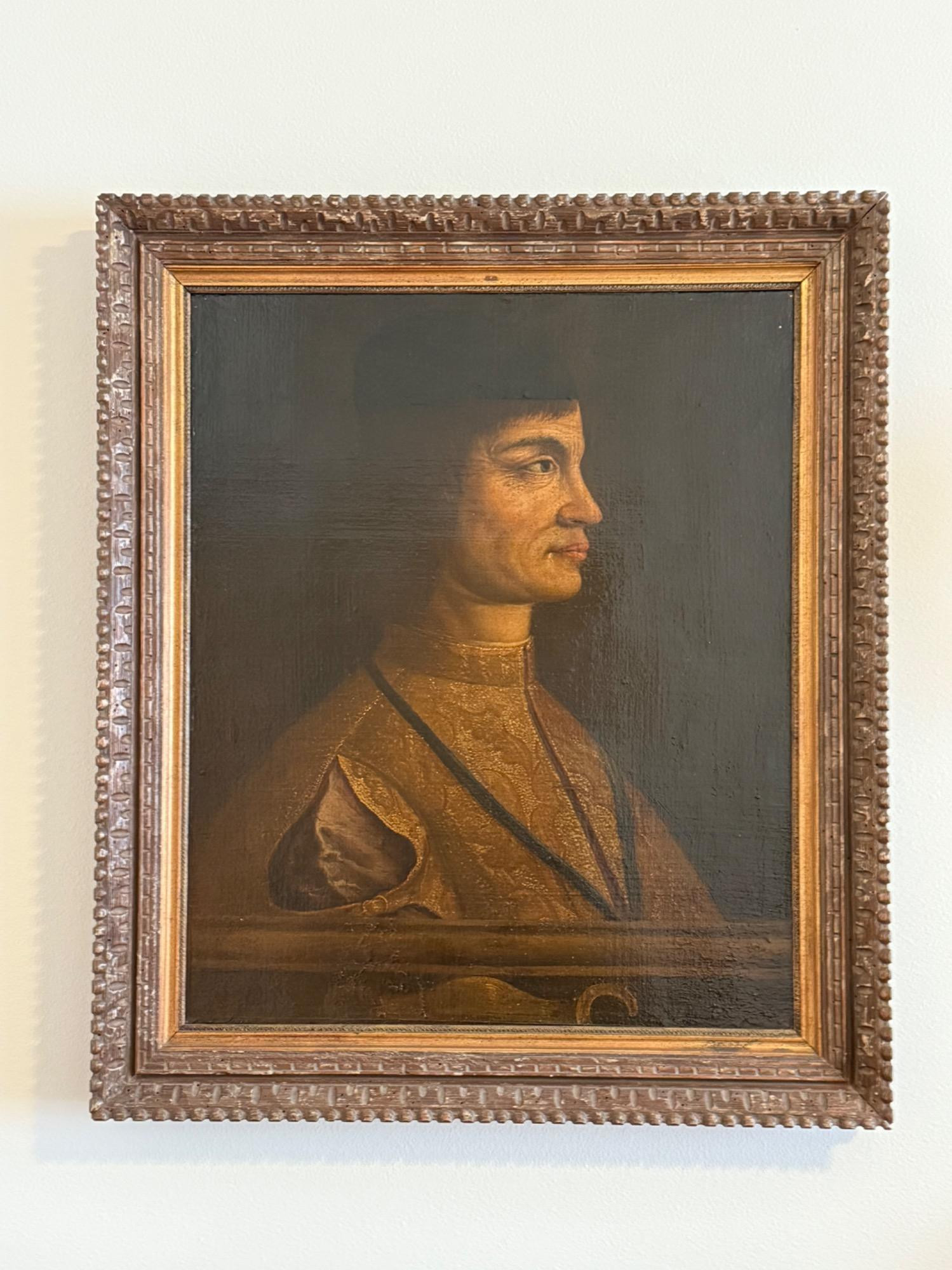 Painting, half-length profile portrait of man in brocade vest, style of Renaissance era, probable Continental, possibly Italian, origin. Date undetermined but possibly 19th century, and based on an earlier work. Relined, with restoration. Carved wood period frame with beaded edge and gilded detail. Overall 29" h. x 25" w.