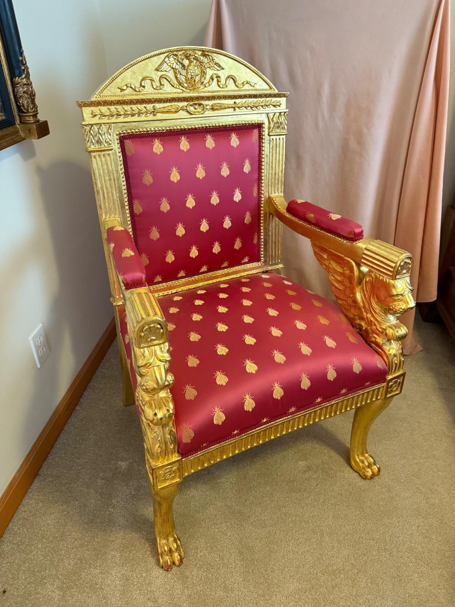 Armchair, Empire period, fauteuil form with heavily carved frame, arched crest with raised eagle, laurel and ribbon motif, columnar stiles with leafy capitols below a leaf-carved band, open arms with upholstered pads and detailed winged griffin supports, on short cabriole legs terminating in paw feet. Evidence of handwork, ca. 1810-1820. Restored gilded finish, reuphol- stered in deep fuchsia silk with a repeating Napoleonic bee motif. 42" h. x 25 1/2" w. x 22 1/2" d.