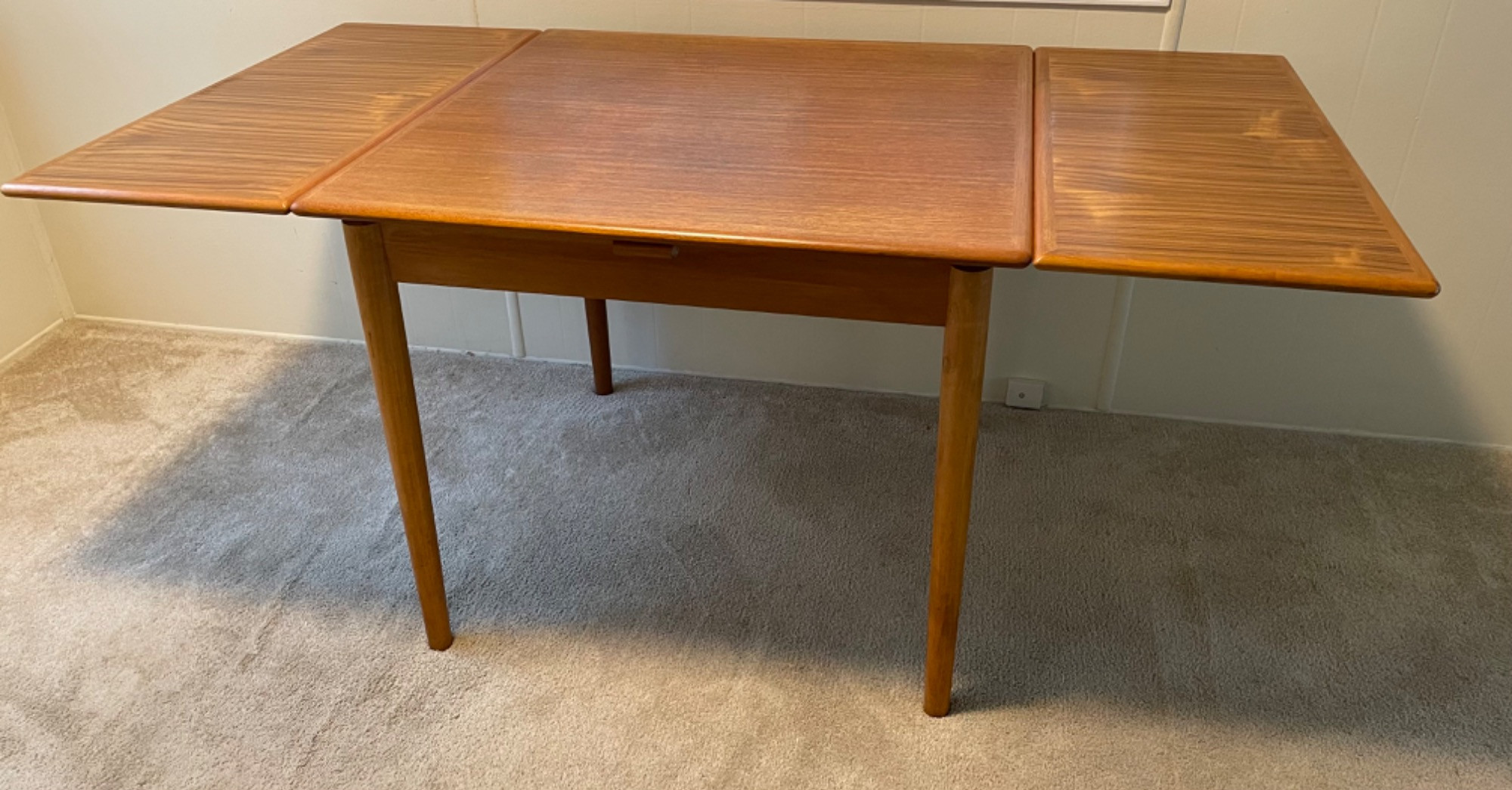 MCM Danish Teak Dining Table By AM-Extends Closed Measures- 33.5 x 33.5 Open Measures- 33.5 x 63.5 28" Tall Solid teak-good condition- Denmark made. THIS PIECE IS IN SEQUIM, IT IS A DIFFERENT PICK UP FROM THE REST OF THE AUCTION. TO MAKE ARRANGEMENTS TO PICK UP, PLEASE CONTACT KATHY-206-552-5307