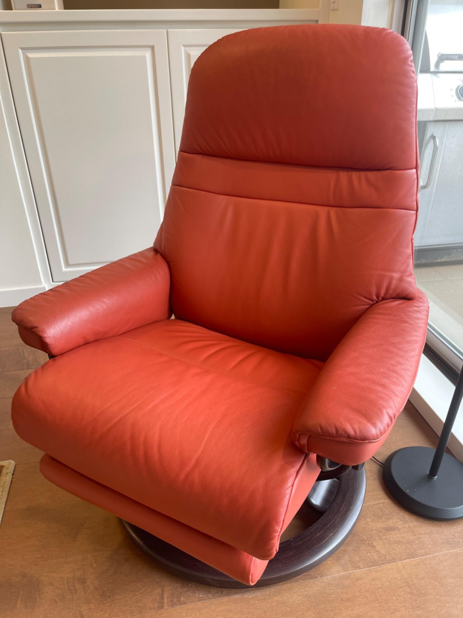 Stressless Brand Norway Fine Leather Electric Recliner - Reddish/Orange Great working condition. Some minor scuffs and staining to leather, but very minimal.