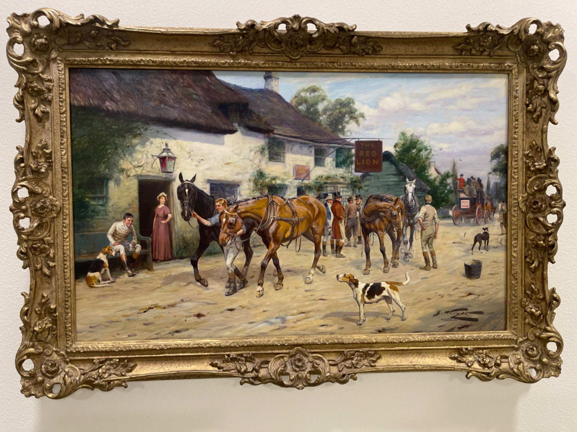 Original George Wright “Changing Horses at the Red Lion” Painting Medium: Oil George Wright (30 June 1860 – 11 March 1944) was a painter in oils whose subjects were mainly drawn from hunting, with which he was familiar, being a fox-hunter himself, coaching and other equestrian topics. George Wright was one of the foremost equestrian artists of his time. He was one of a family of seven children, five of whom were professional artists, either principally as painters, or as illustrators. Some cracking and chipping to frame. Appraisal was done in 2004 by Rowles Fine Art. The appraisal for art work will be included. Appraised at $25,000.