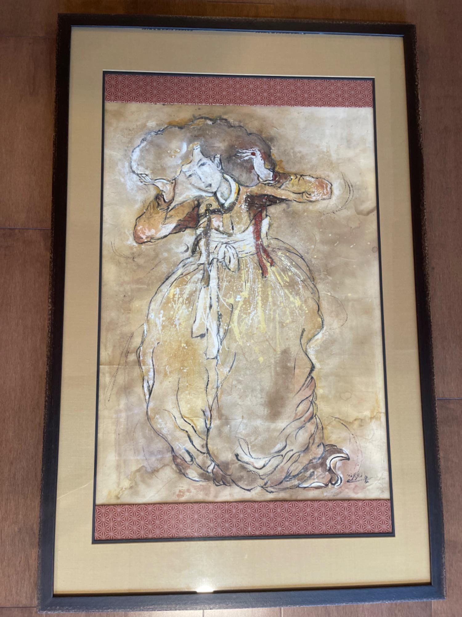 LARGE Original Watercolor Painting - Traditional Regalia Depiction Original watercolor, quite large and professionally framed with UV protective glass. Features woman in traditional regalia at a Korean festival, adjusting her wig. The framing is super high-quality, with silk borders.