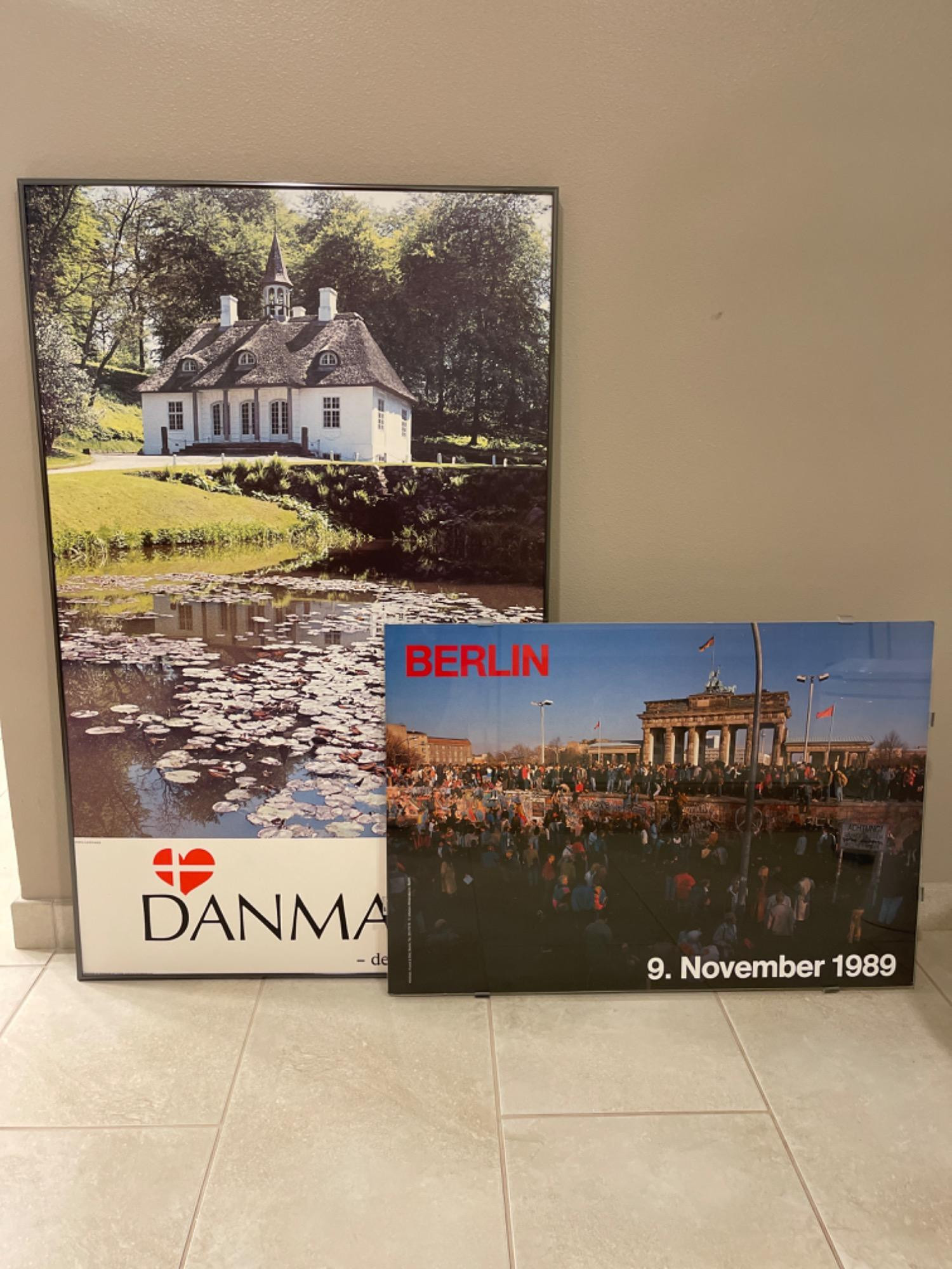 Framed Travel Prints-Berlin and Danmark Casing around Berlin photo has cracking on the edges and corners that is taking good care of inside piece. Berlin: 27.5" W x 19.5" H Danmark: 24.5" W x 39.5" H