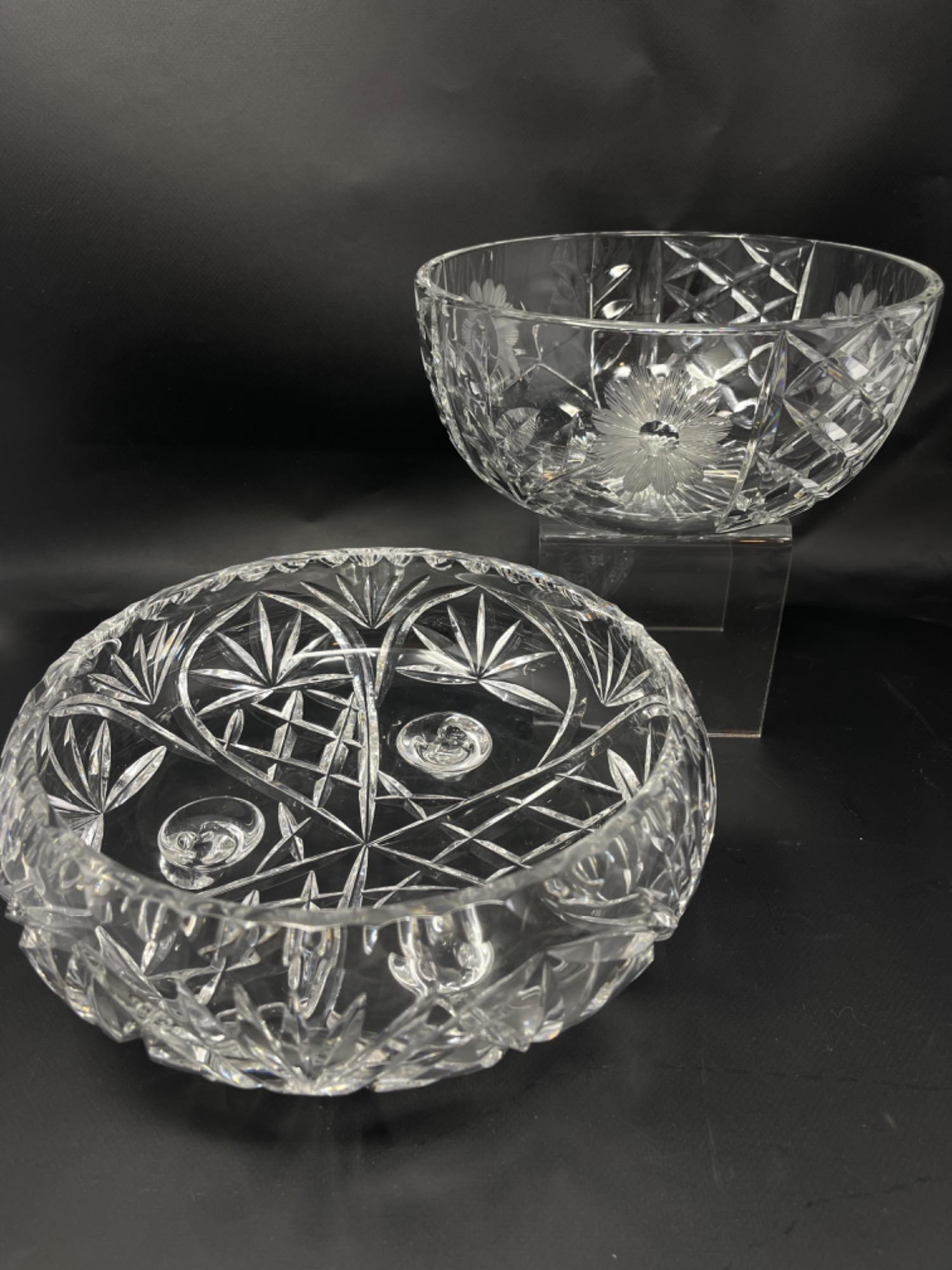Clear Lead Crystal Bowls Bowl with legs has small chip on rim. Largest: 9” W Smallest: 8” W