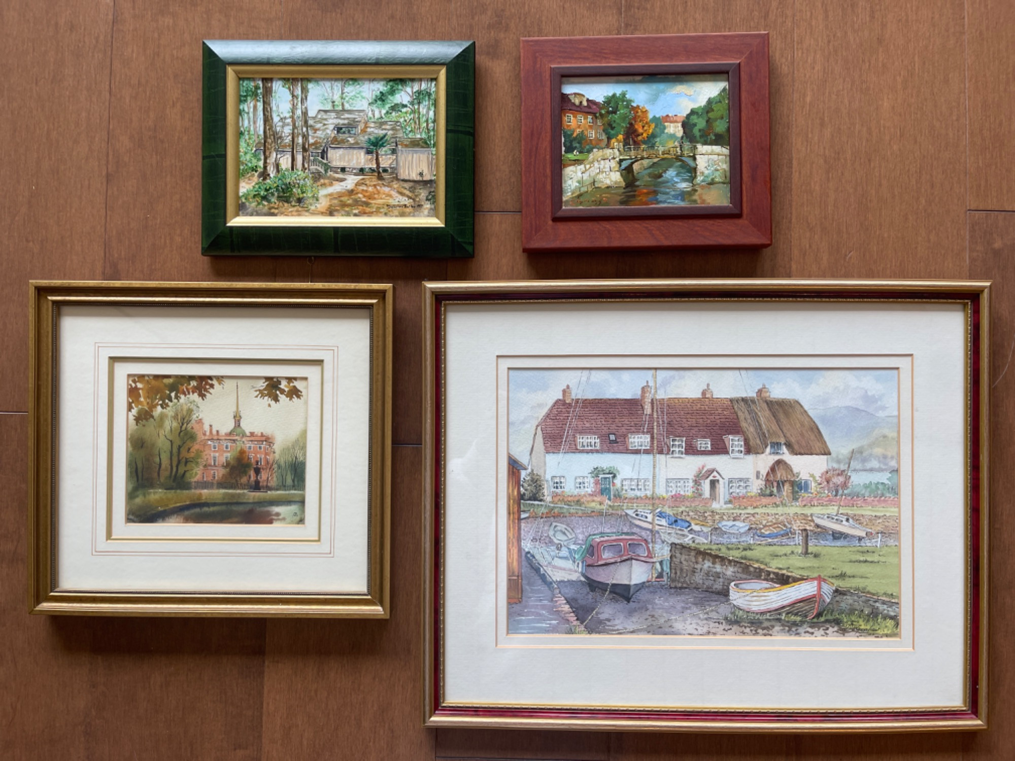 Ensemble of ORIGINAL Paintings! All originals. Top right: Oil and from Russia Bottom left: Watercolor from Russia Top left: From Hilton Head Island, SC. The old house was due to be replaced by a mansion monstrosity and the artist wanted to save a glimpse of the simpler way of life. Bottom right: Watercolor from England Largest: 19" W x 15" H Smallest: 8.5" W x 7.25" H