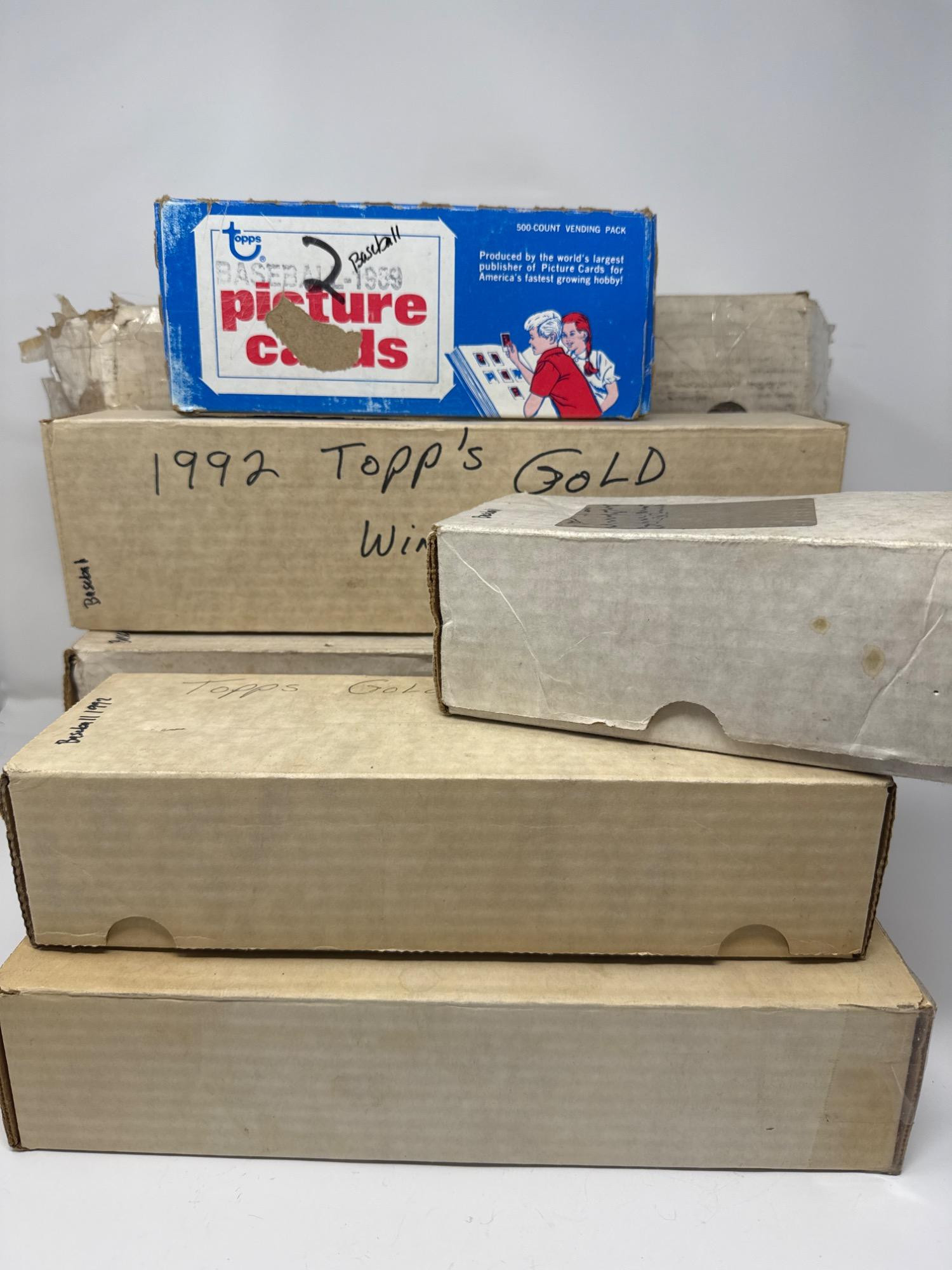 11 boxes with baseball cards from 1987 through 1992. Most are new. One box with wrapped cards. Topps gold, Don Russ and more. Don Robinson, Wilson Alvarez, Mariano Duncan, Kirby Puckett, Bobby Witt, Tim Belcher, Ken Griffey Senior, Cecil Fielder, Tony La Russa, Tyrone Hill, George Bell, Sandy Alamar, Ken Griffey Junior, Ozzie Guillen, Bo Jackson, Sammy Sosa, Robin Yount, Roger Clemens, Carlton Fisk, Wade Boggs, Edgar Martinez, Jay Buhner, Cal Ripken Junior, Kurt Schilling, Jose Canseco, Randy Johnson, Ricky Henderson, Derek Jeter, Jason Giambi, Alex Rodriguez, and more. In one box, all the cards are encased. Sets not verified.