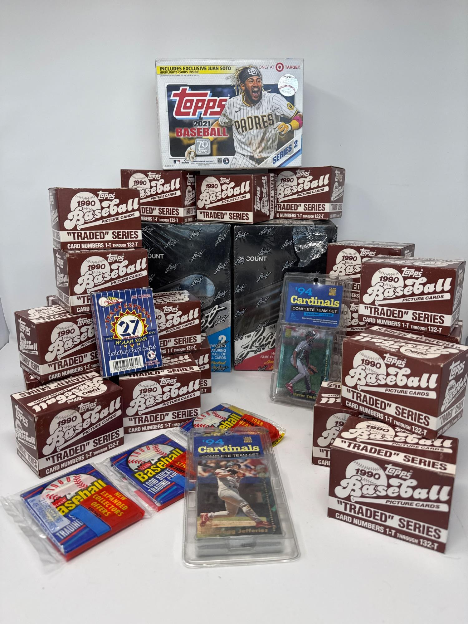 NIB. Series one and series 2 Leaf sets. 1994 Cardinals complete team set. 1988 Fleer baseball set. 2021 Topps series 2. A total of 23 boxes of 1990 baseball “traded” series.