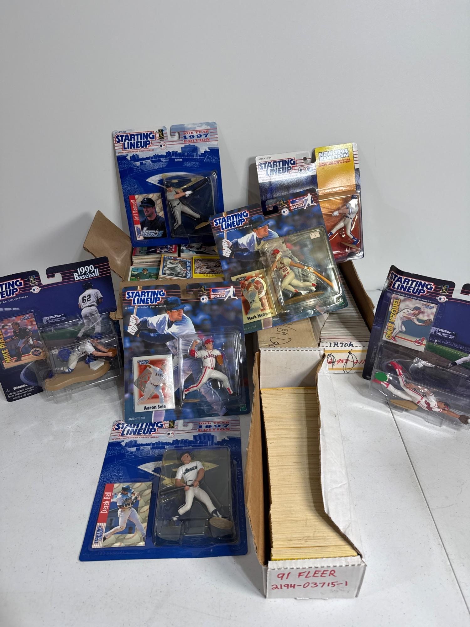 Large collection of baseball cards. Some are mixed. Dennis Eckersley, Harold Baines, Willie Randolph, Rick Honeycutt, Dwight Gooden, Willie McGee, Gregg Olson. Fleer, studio, Don Russ, and other brands. Starting Lineup action figures. Mike Piazza, Jeff Bagwell, John Olerude, Omar Vasquez, Mark McGuire, Derek Bell, Aaron Sele.