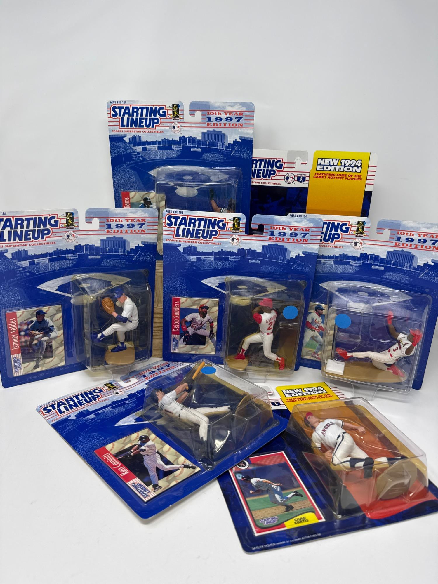 NIB. Starting Lineup baseball figures. 1994 and 1997 editions. Chad Curtis, Ken Caminetti, Ismael Valdez, Deion Sanders, Brian Jordan, Bernie Williams, Chris Hoyles.