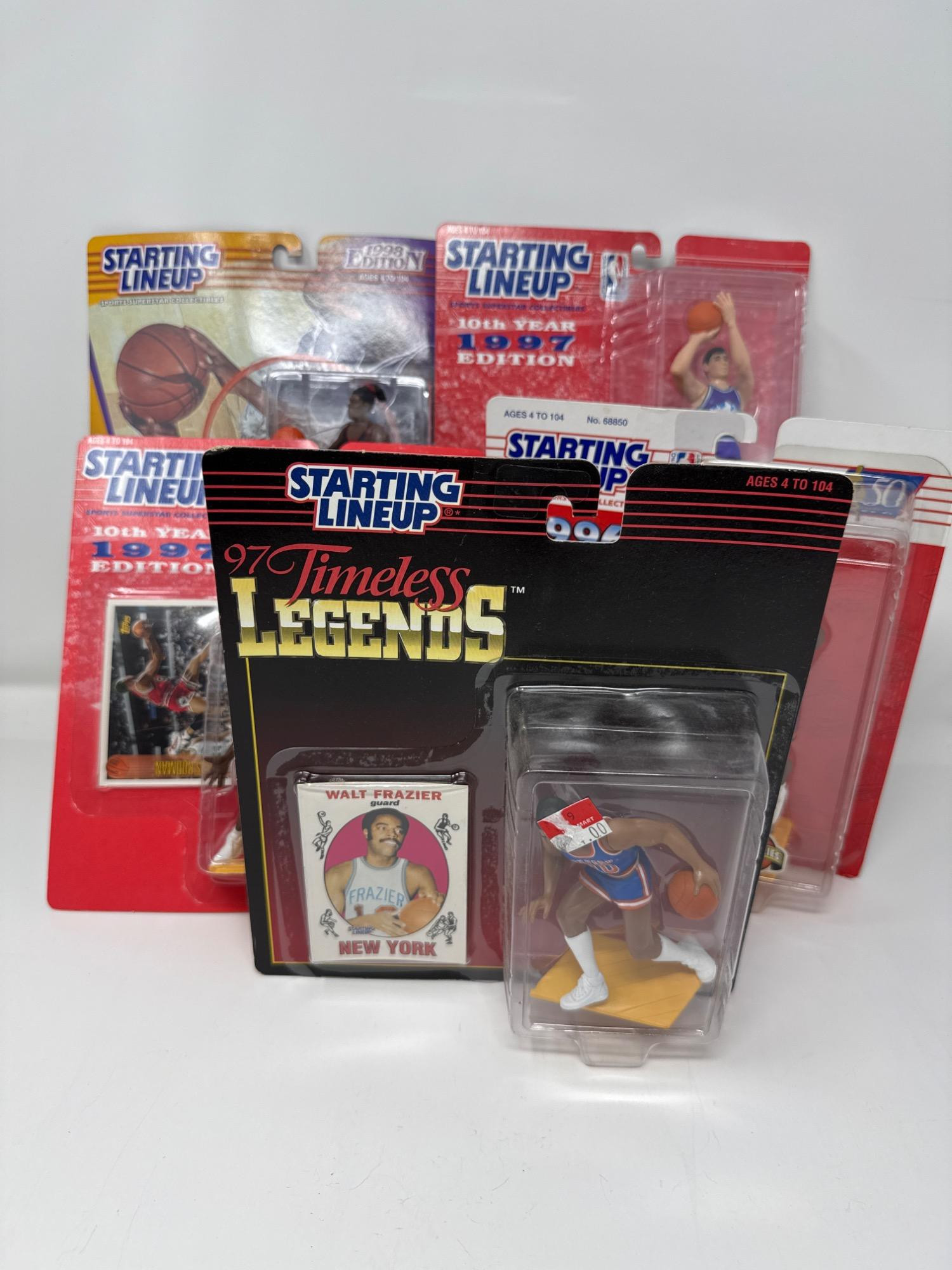 NIB. Starting lineup basketball series. Includes collector cards. Walt Frazier, Dennis Rodman, John Stockton, Cheryl, Swoopes, and Johnson.