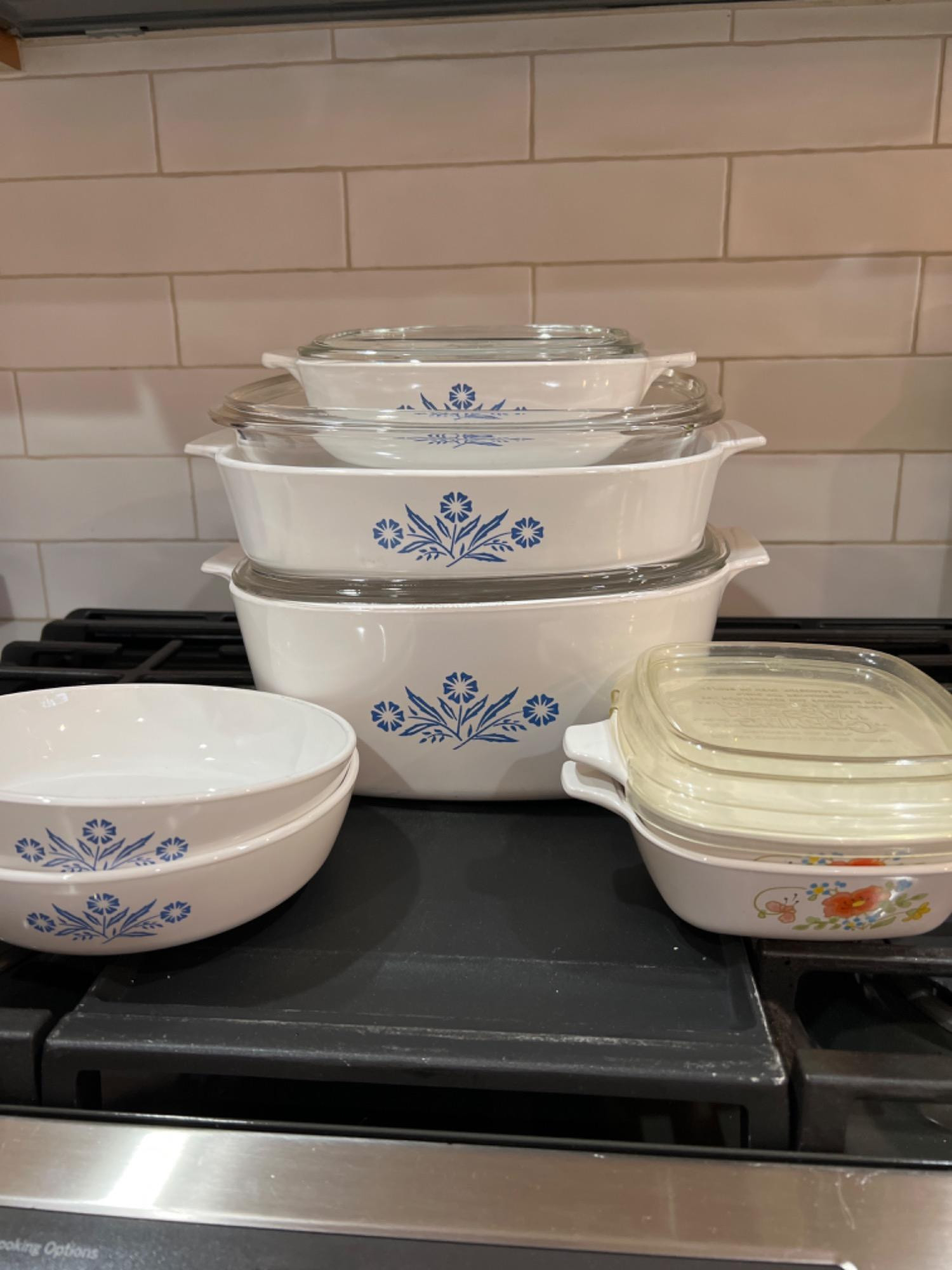 Three vintage Cornflower Corningware baking dishes with glass lids. Two cornflower handled saute pans. Two vintage Wildflower baking dishes with hard plastic lids.