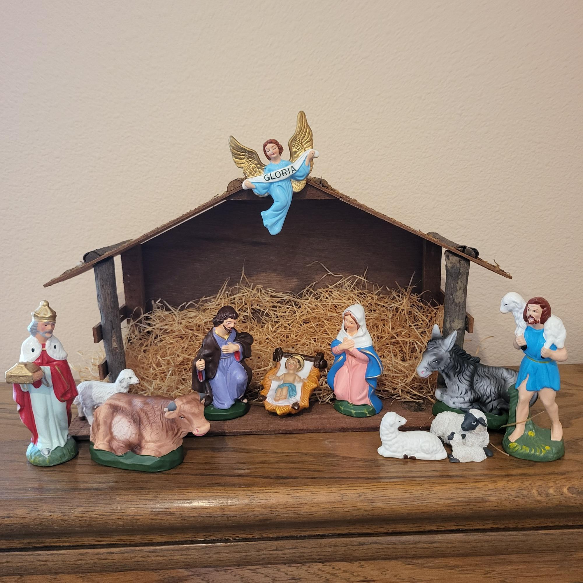 Vintage Nativity 16" x 9" x 6". Figures are 4"-5" and animals are 2" to 4". Baby Jesus is 3" x 2". Comes with original box. Made in Japan.