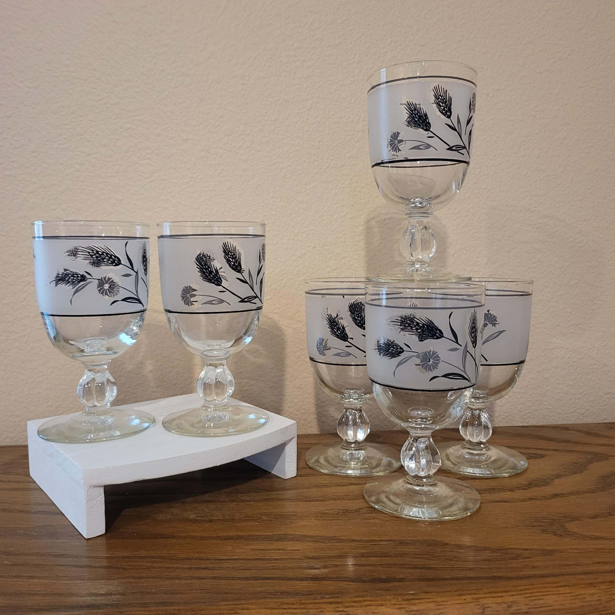 Six 6" tall clear glass Libbey water goblets with frosted grey band and etched Wheat/Wildflower pattern.