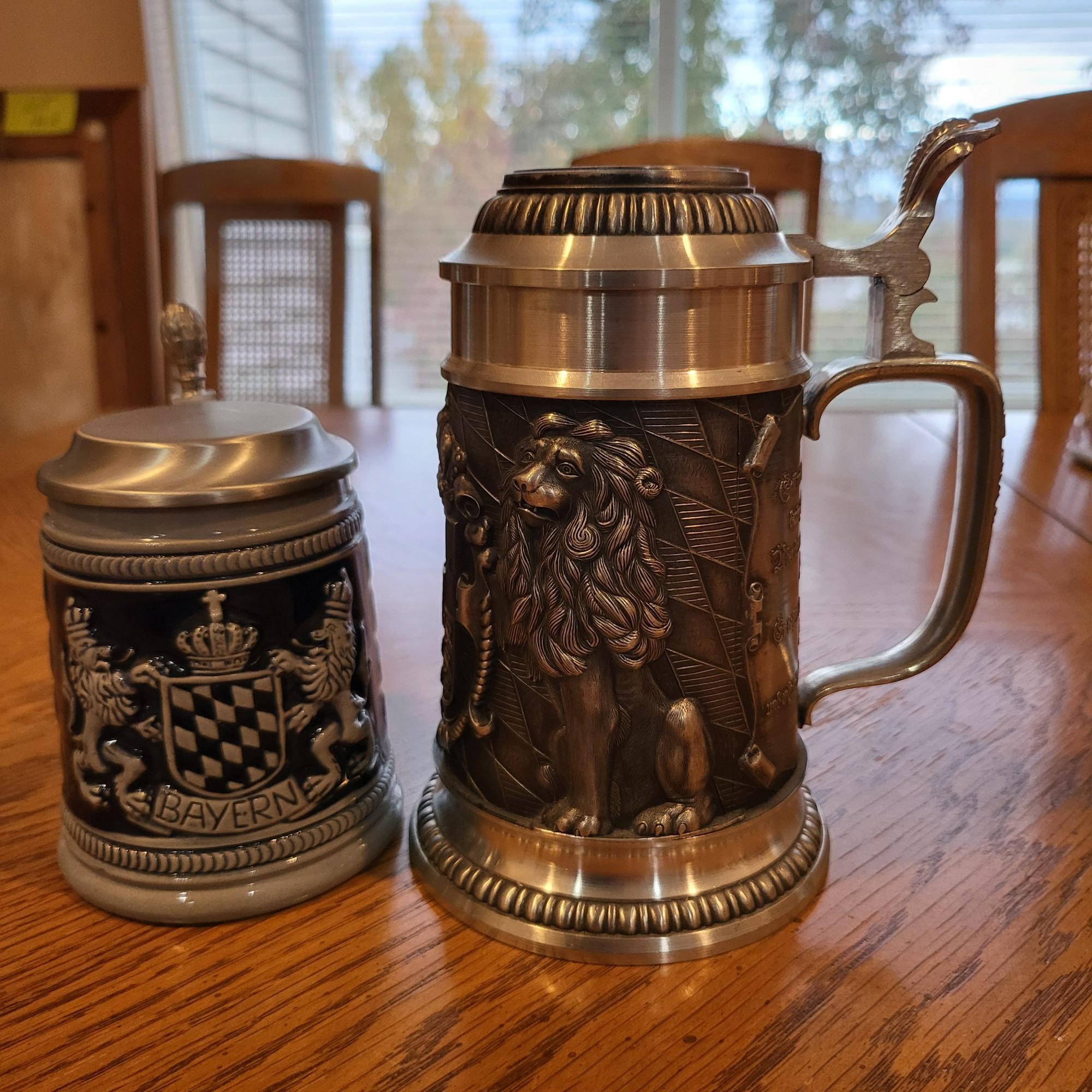Two lidded beer steins, 5" tall and 7" tall purchased by our clients in Munich Germany. One is 95% Zinn Pewter and one is ceramic.