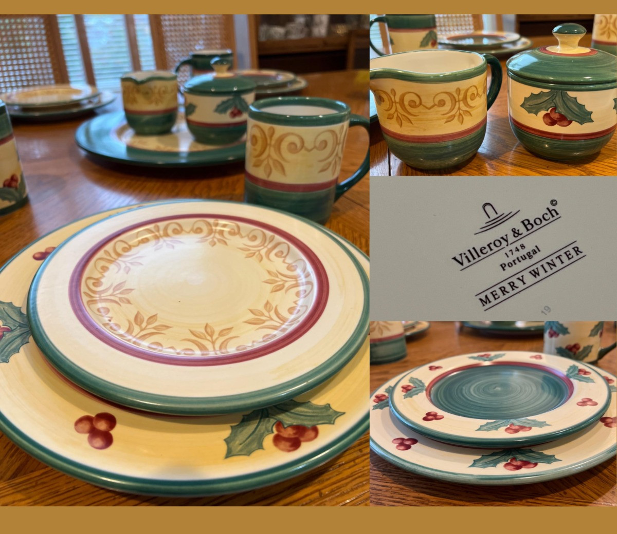 Villeroy & Boch (no longer available) "Merry Winter" holiday dishes originally purchased in Germany at the Christmas Market. The set includes: 6 Dinner Plates - 10.5 inches 6 Salad Plates - 8.25 inches 6 Handled Mugs - 4.5 inches tall (one mug has small chip at the rim). Sugar and Creamer - 4 inches tall Large Platter - 13.5 inches Set has two designs - holly and berry and Spanish scroll. Value ranges between $650-$700.