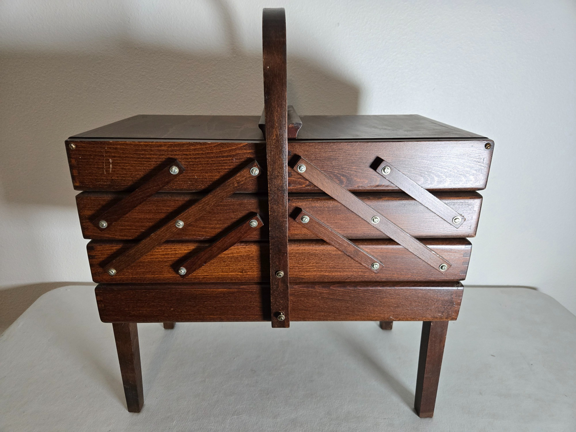 This vintage accordion-style sewing box is a beautifully crafted storage organizer, perfect for sewing enthusiasts, crafters, or collectors. Featuring a fold-out design with multiple compartments, it provides ample space to store sewing essentials, crafting tools, or accessories. The box is in great condition and comes with a few sewing supplies, making it a functional and stylish addition to any sewing space. A perfect blend of vintage charm and practicality, ideal for both use and display!