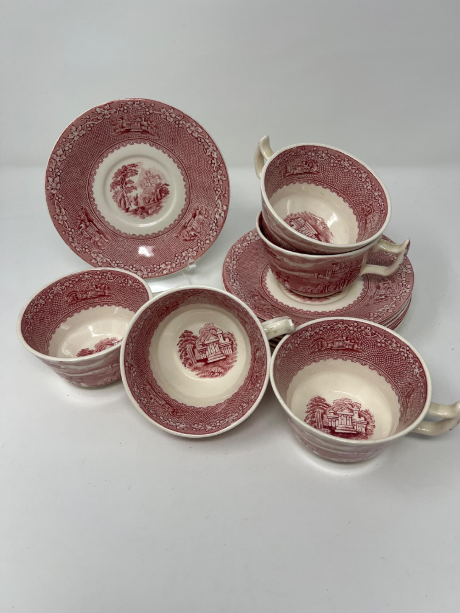 Staffordshire England porcelain cups and saucers with red Jenny Lind transferware pattern. This pattern named after Jenny Lind, a singer with the voice of a nightgale, was produced in 1930's. There is a chip on the underside rim of one saucer. There are 7 saucers and 5 cups.