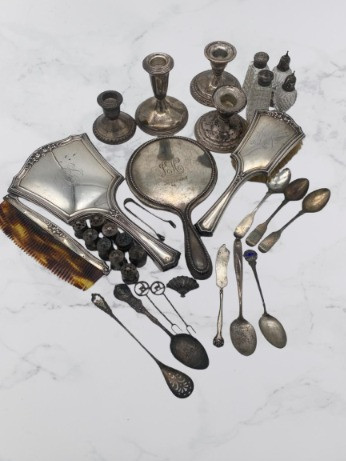 Collection of Sterling Silver Mirror & Brush Set, Spoons, & More. Collection of sterling silver items, including a mirror & brush set, candle holders, spoons, and more. Please note: most pieces show signs of damage and dents, and the comb is not original. See pictures for gram weights and further details on condition. A great lot for collectors or those looking to repurpose sterling silver.
