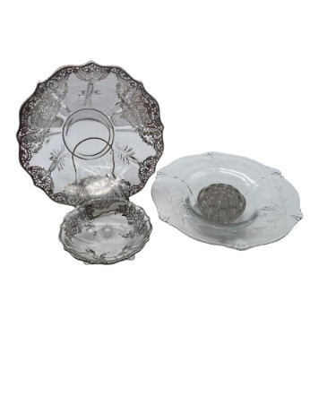Heisey-style 3-toed bowl with floral frog, possibly featuring a wheel-cut floral design, though unmarked. Includes two sterling overlay bowls: one measuring 11 1/2 inches and the other 6 1/2 inches. A stunning collection of vintage glassware and silver accents, perfect for display or entertaining.