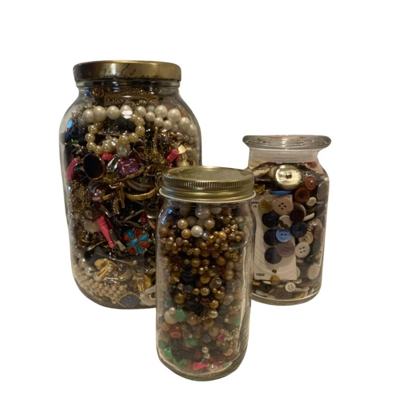 Beads, buttons, and junque jewelry—17 pounds of crafty fun and potential profit! This lot includes three jars brimming with materials perfect for crafting, repurposing, or resale.