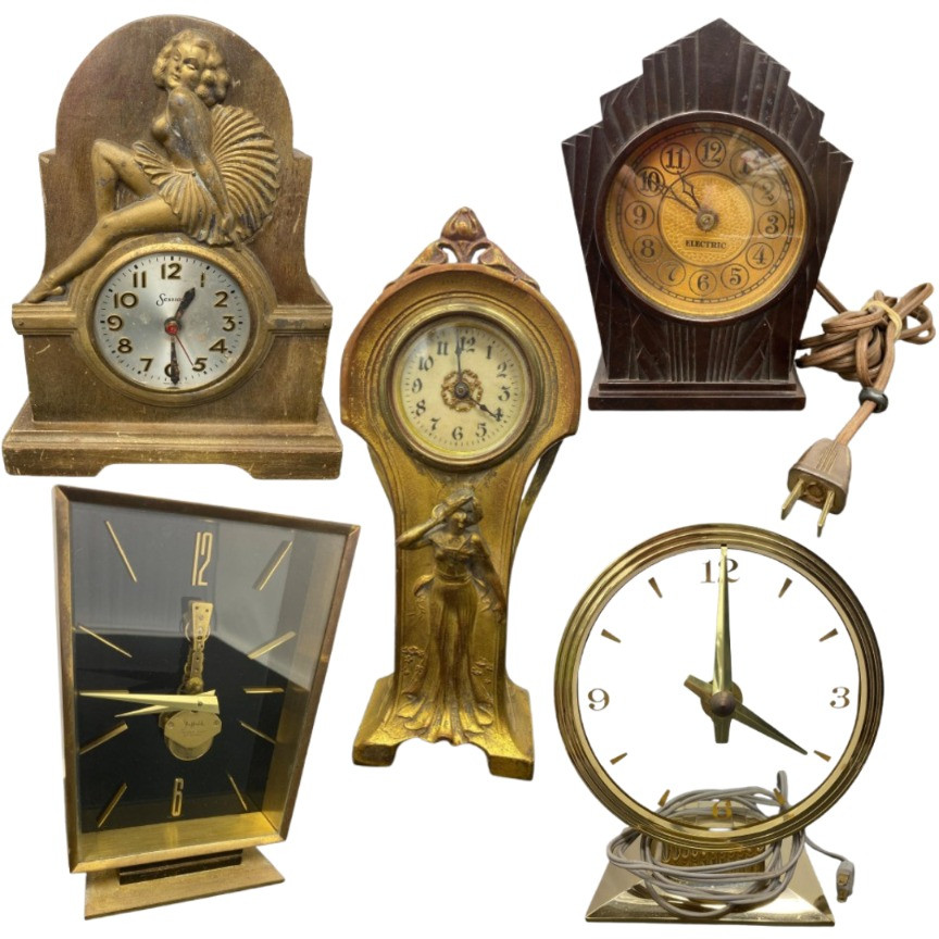 This diverse collection includes a variety of unique clocks, each with its own style: Clocks range in height from 7" to 11" tall. None of the clocks have been tested, making them great for collectors or restoration enthusiasts.