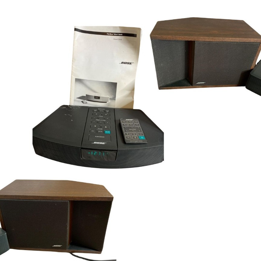 This Bose Wave Radio Model AWR1-1W 201 Series II offers excellent sound, having been enjoyed for months with great audio quality. The direct/reflecting speakers come with a free field tweeter, but please note the speakers were not tested due to missing wires. The remote needs a new battery. The graphite gray unit features a vinyl veneer laminated cabinet and is made in the U.S.A. with a 8-ohm impedance. Perfect for music lovers, this set delivers iconic Bose sound. Additional Details: The BOSE Wave Radio Model AWR1-1W 201 Series II Direct/ Reflecting Speaker with Free Field Tweeter Graphite Gray 018821 Cabinet Construction - Vinyl Veneer Laminated To Particle Board IMPEDANCE 8 OHMS Bose Corporation, Framingham, MA 10701-9168 U.S.A. Made in the U.S.A. from domestic and foreign components.