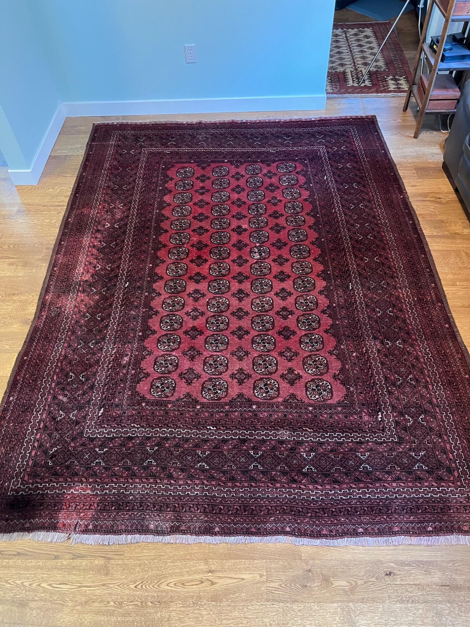 Beautiful traditional hand knotted area rug that is potentially Bukhara region or possibly Turkey or Afghanistan. The pattern is commonly crafted by artisans in this part of the world. The design of the rug suggest it could be nearing antique age. Rug has a few faded spots or it needs to be cleaned.