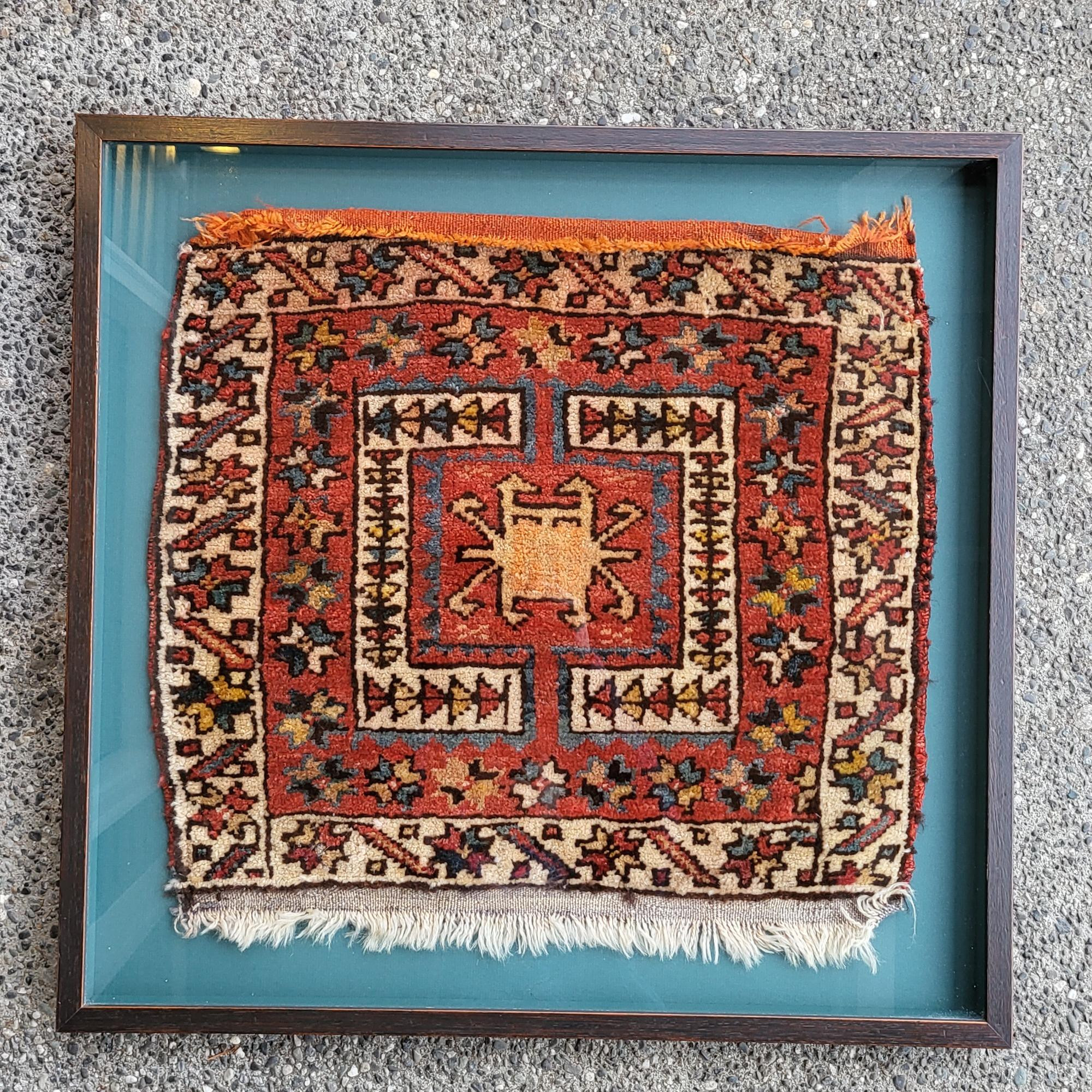 This hand made (either woven or knotted) wool rug is 26" x 25" and professionally framed by Tsuga (a local Bothell, Wa company). Potentially the face of a saddle bag from the Turkish region and potentially dated to the 19th Century. The design and craftmanship is in keeping with other saddle face bags from this region and time period.