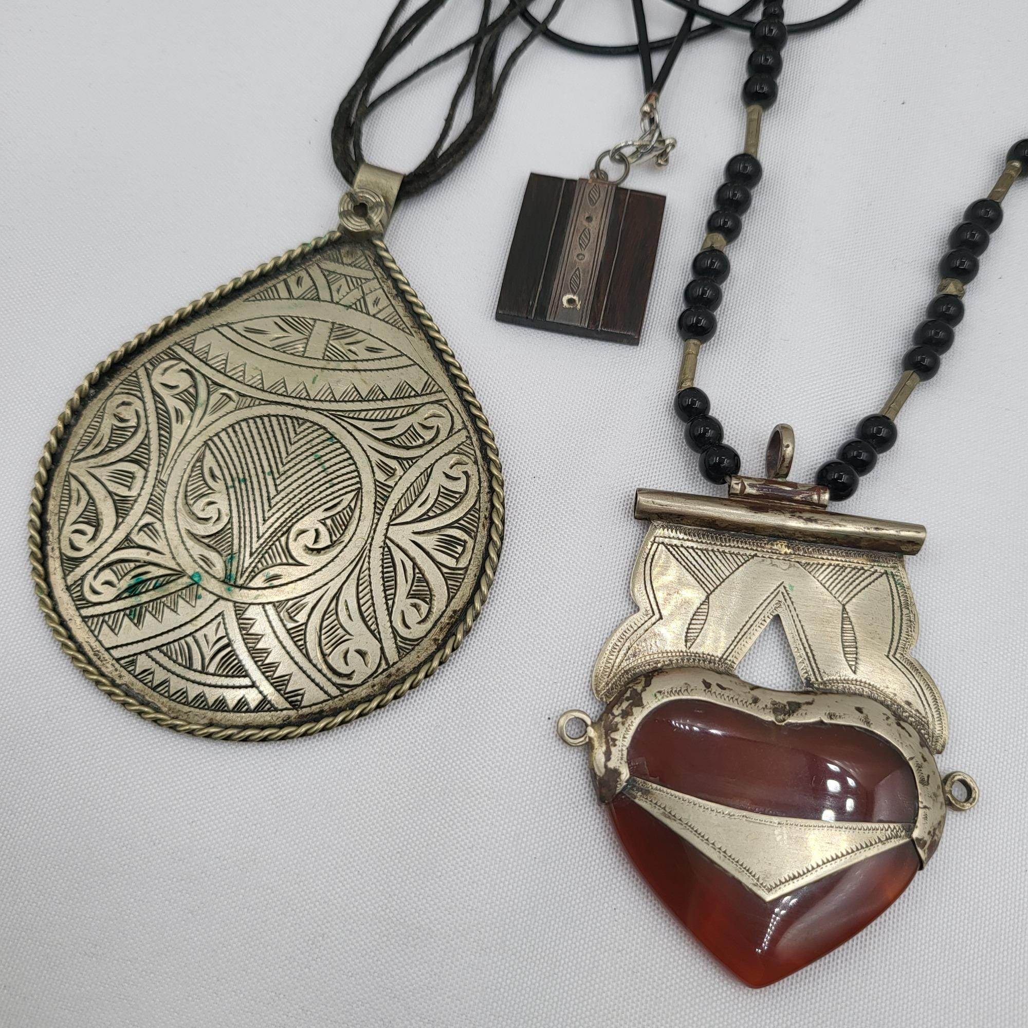 Tuareg tribal 17" beaded necklace with 3" x 2" heart shape Carnelian stone & etched metal amulet pendant. Large pear-shape highly detailed etched amulet on a 4-stand cord necklace. Smaller, dark wood & silver pendant 1" x 1.25", currently on a 16" cord chain.