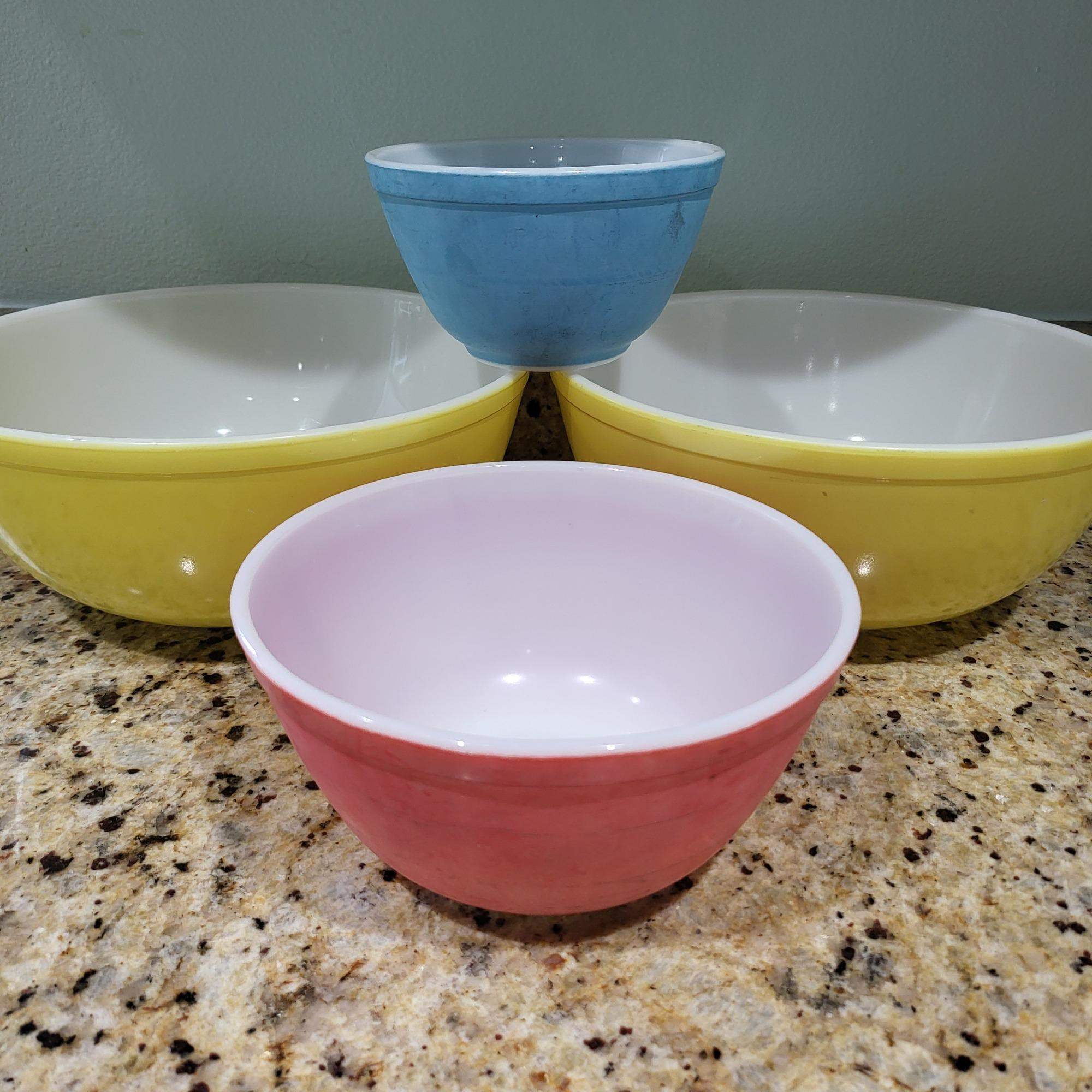 Two yellow 4-qt Pyrex mixing bowls (10" x 4.5") & two smaller bowls (7" x 3.5" and 5.75" x 3.25").