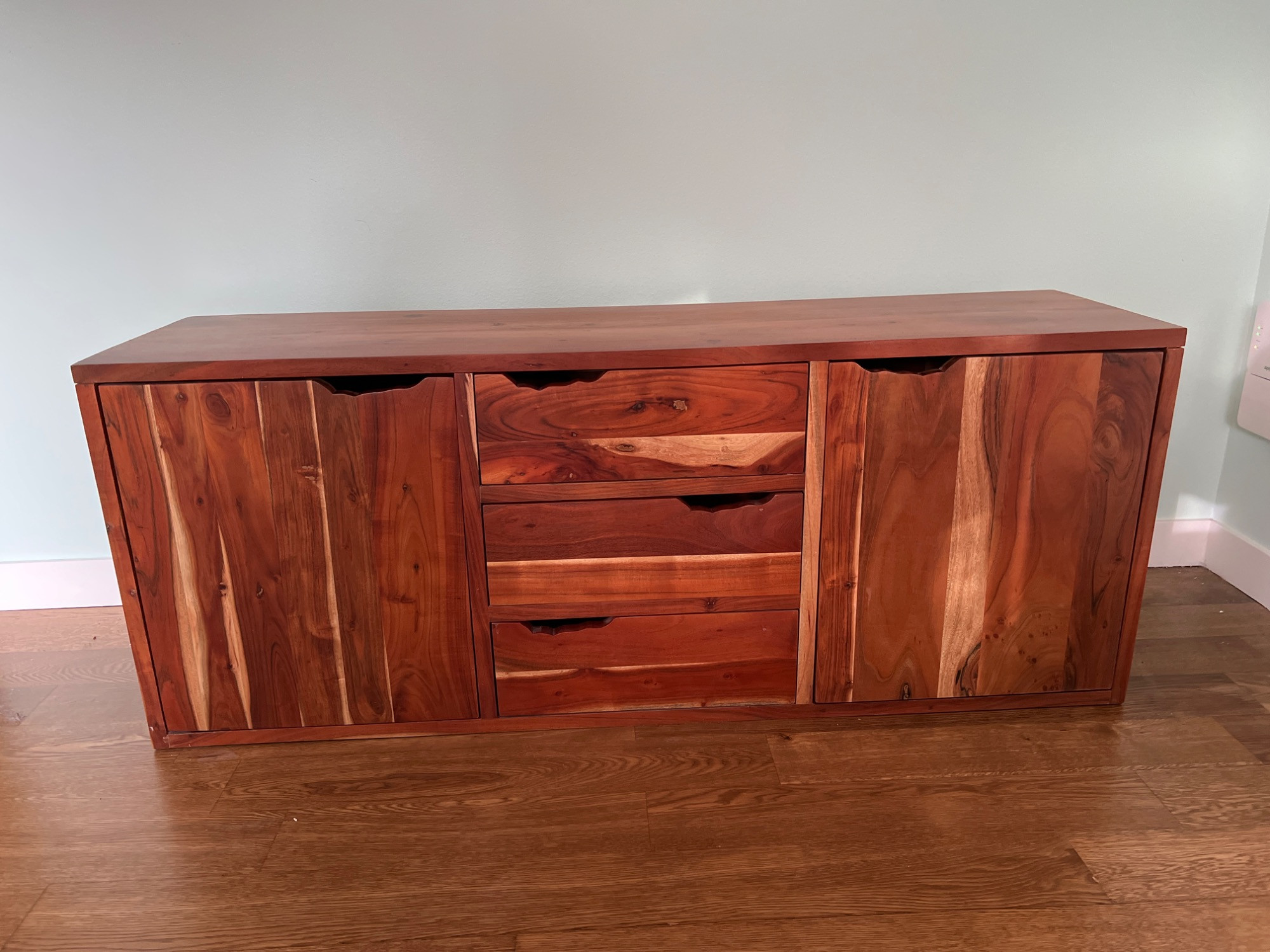 Rustic solid wood console with side cabinets and shelving and three middle drawers. Rustic style cut-outs in wood for handles. Back of cabinet has damage where wood is gouged but unnoticeable from the front and does not affect integrity of cabinet. We believe this is sheesham wood. It is thick and extremely heavy. On first floor near door exiting through garage. Bidding on this lot is an agreement that: (1.) You will have 2 capable, able-bodied persons to lift and load at a minimum. (2.) You