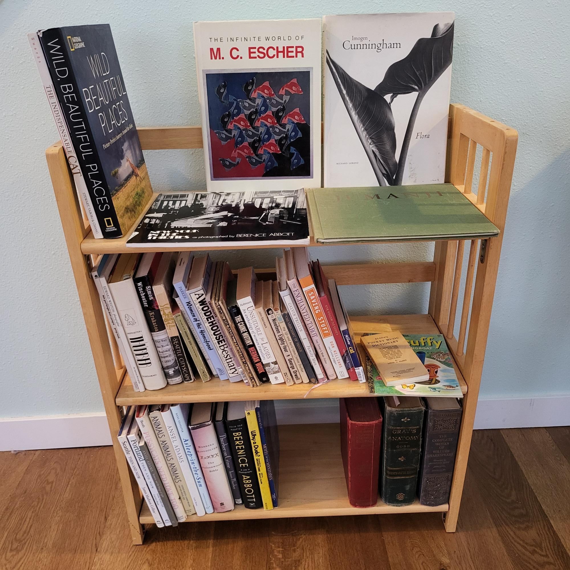 Light colored wood bookcase or storage shelf. There are three shelves that fold up to collapse case. Includes all books.