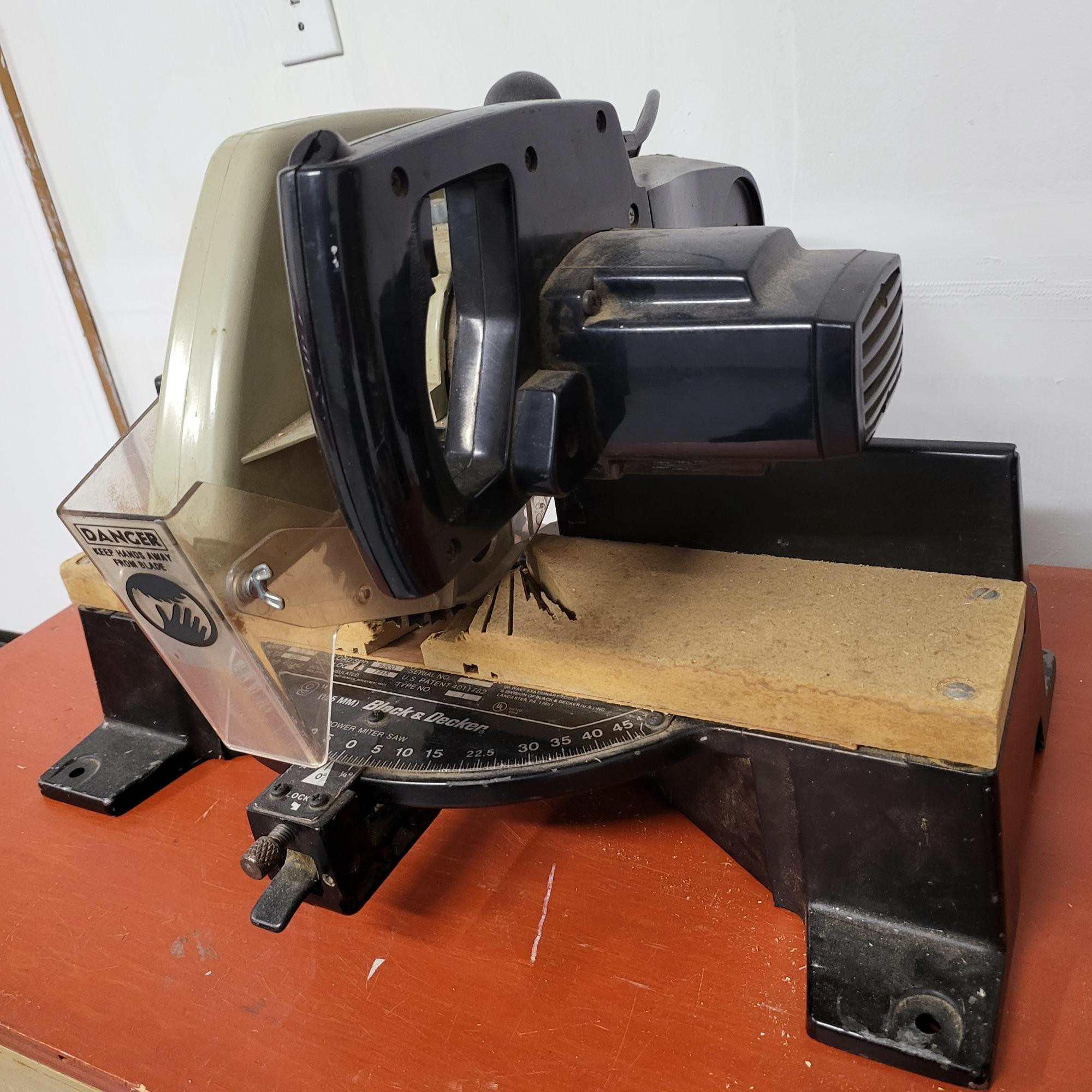 Dewalt 9" Power Miter Saw 7715. It's attached to a Black & Decker base. Powers on.